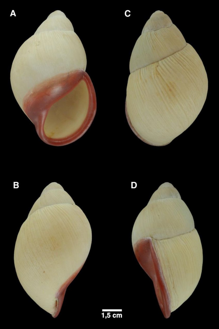 Figura 1: Beltramino, 2016: Colección Malacológica del Museo de La Plata, concha adulta de Megalobulimus lorentzianus, MLP-Ma 14079/2