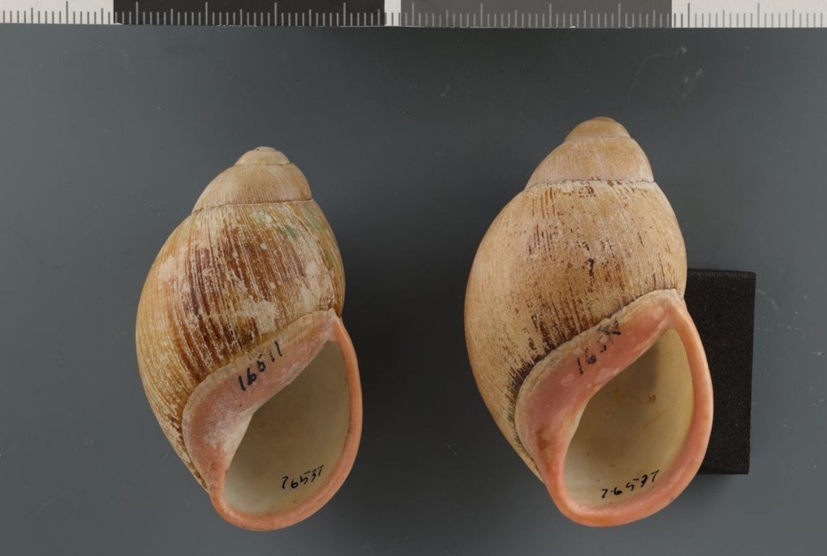 Figura 1: Beltramino, 2016: Colección Malacológica del Museo de La Plata, concha adulta de Megalobulimus oblongus musculus, MLP-Ma 14091/1