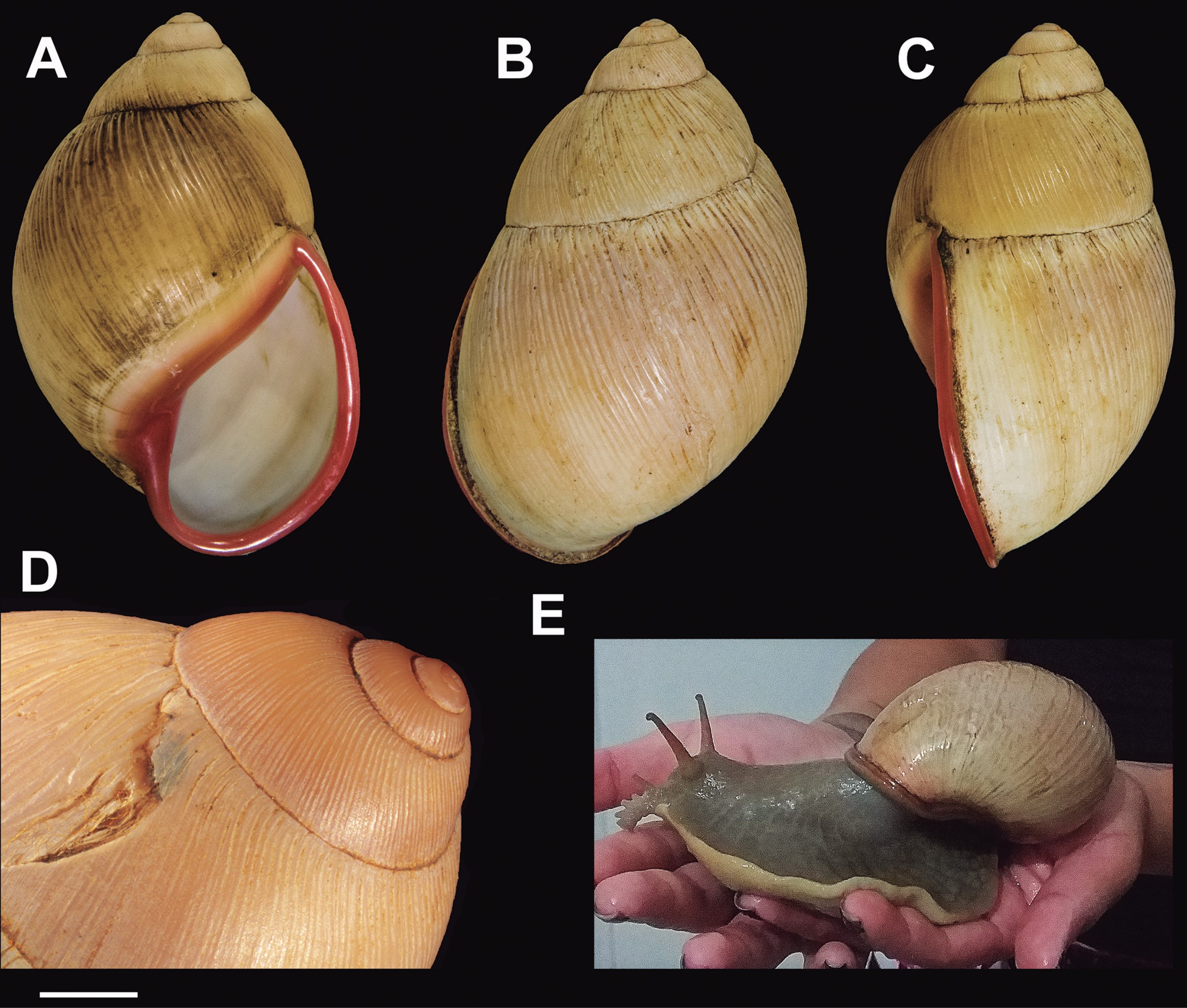 Figura 2: Silva F dos S, Simone LRL (2022); Megalobulimus oblongus: (A‑D) conchas do espécime coletado em Mortugaba, Bahia, MZSP 136679 (L = 118,3 mm, W = 72,0 mm); escala = 10 mm; (E) animal vivo de Megalobulimus oblongus (Müller, 1774)