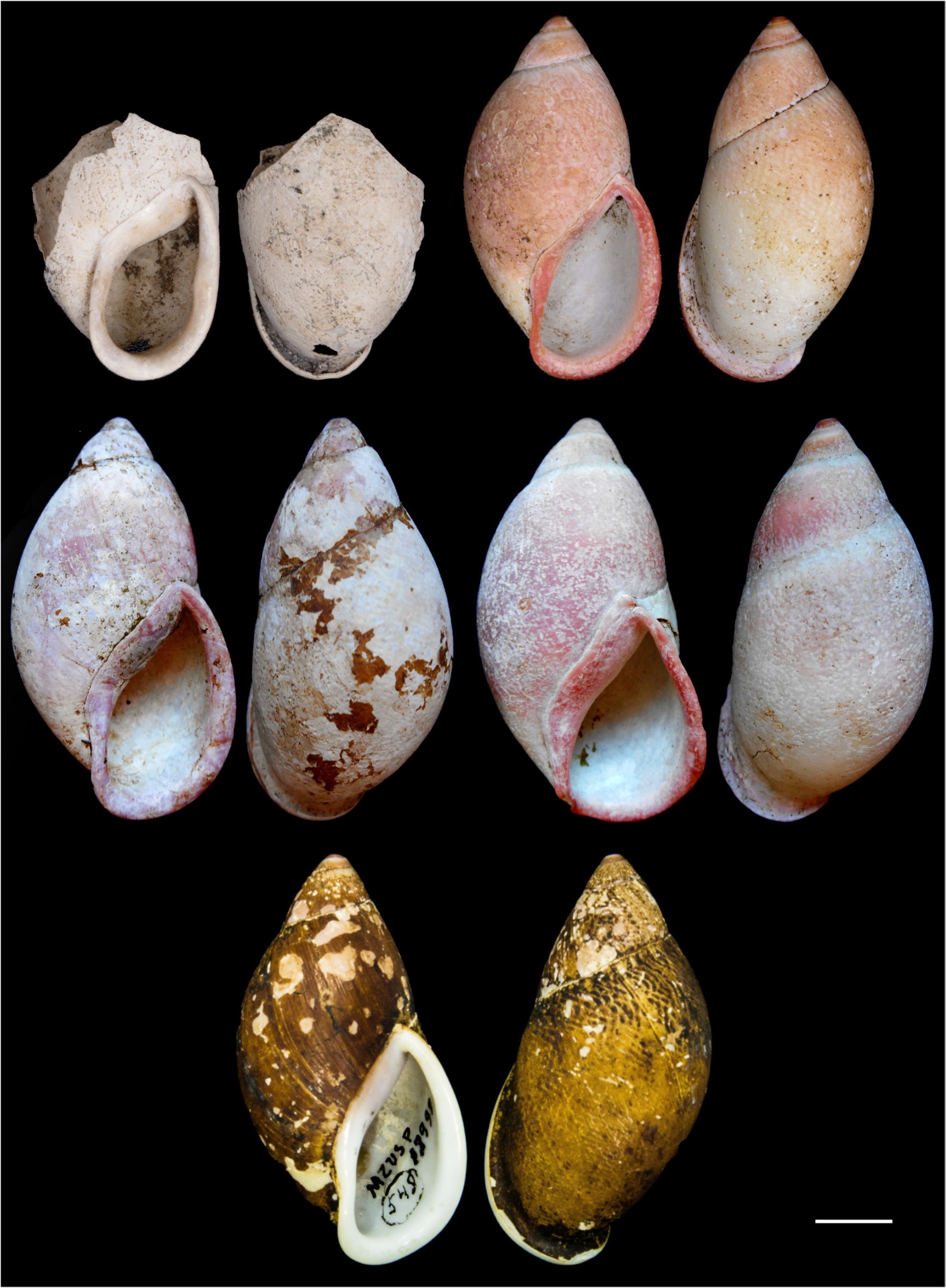 Figura: Guernet et al. 2022: (3–7) conchas de Mirinaba cadeadensis: (3–4) LEBIO 578, “from the Boguaçu shell mound”, 53mm; (5) LEBIO 587, “from Morro Itaguá” 56.3mm; (6) LEBIO 588, “from Morro Itaguá”, 57.2mm; (7) Museu de Zoologia de São Paulo, HOLOTYPE, MZUSP 18998, Cadeado, Paraná, 59.0mm
