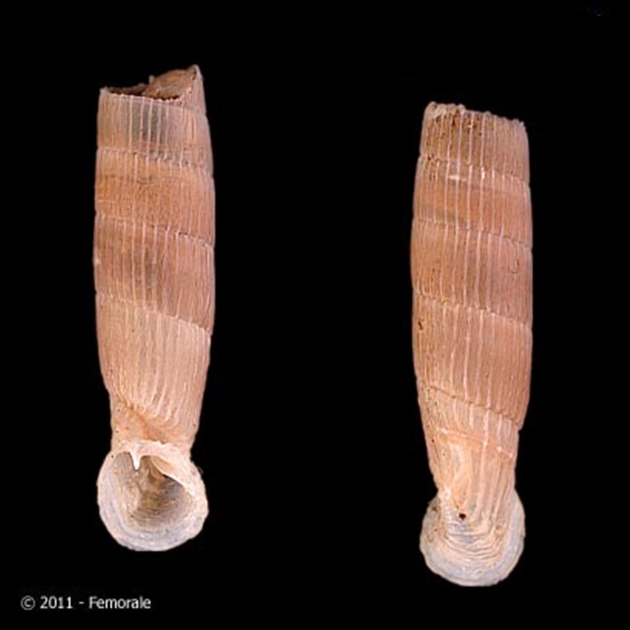 (Nordsieck, 2010): “Shell decollated, nearly cylindrical; yellowish-white or yellowish-brown; teleoconch whorls strongly and regularly widely ribbed, ribs straight, on lower whorls also oblique, in part white, additionally with more or less distinct regular rib-striae (R1 8–13), on the neck ribs more distantly spaced and undulate; basal keel broad, dorsal keel prominent, parallel to and higher than basal keel, neck flattened or weakly impressed above, subsutural swelling ± distinct; aperture descending, oval-roundish or rhombic, yellowish-white or yellowish-brown within, peristome more or less expanded;