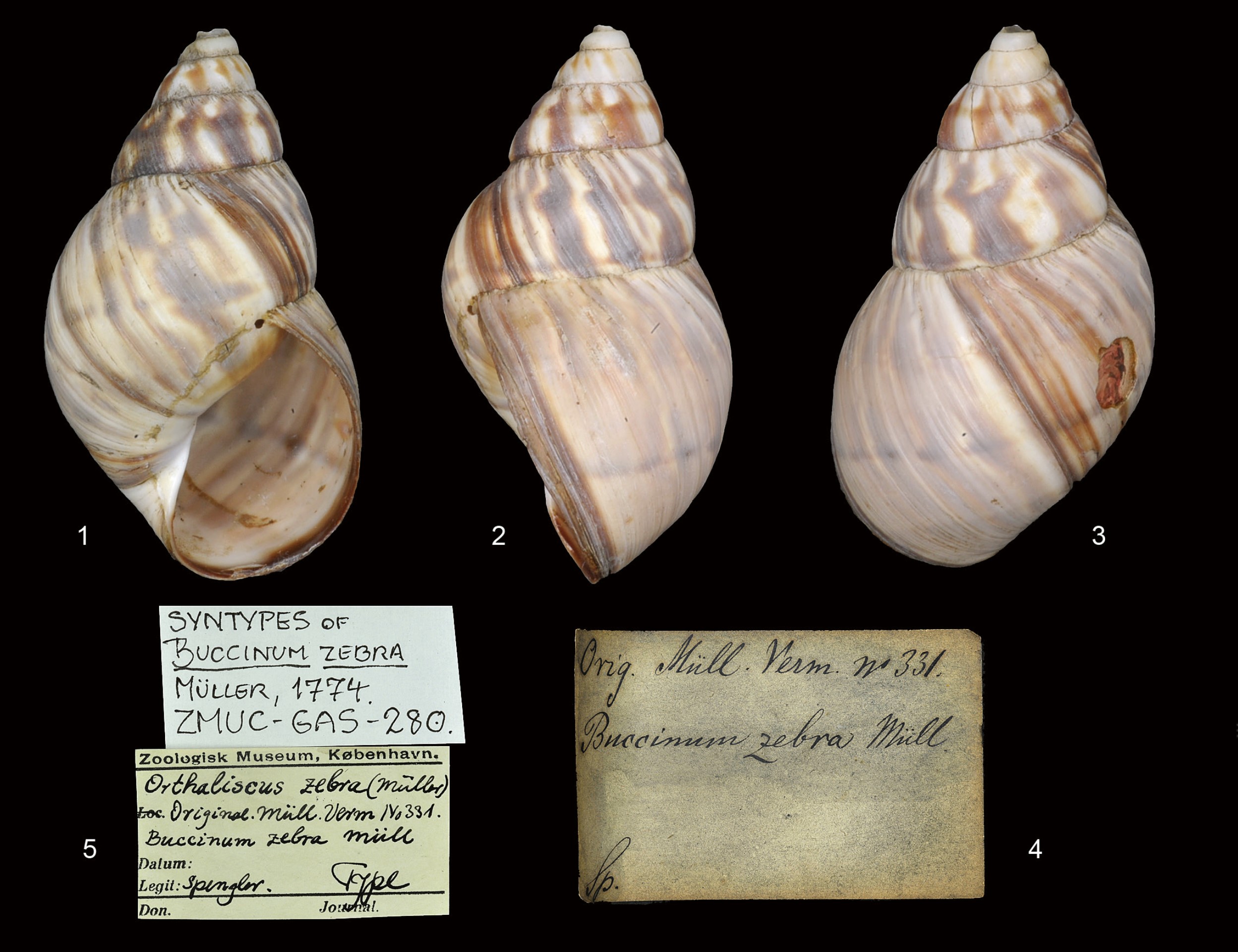 Fotos: Breure et al. 2021: Natural History Museum of Denmark, University of Copenhagen: LECTOTYPE de Buccinum zebra O.F. Müller, 1774, NHMD 873804, Spengler collection, 46.0 mm