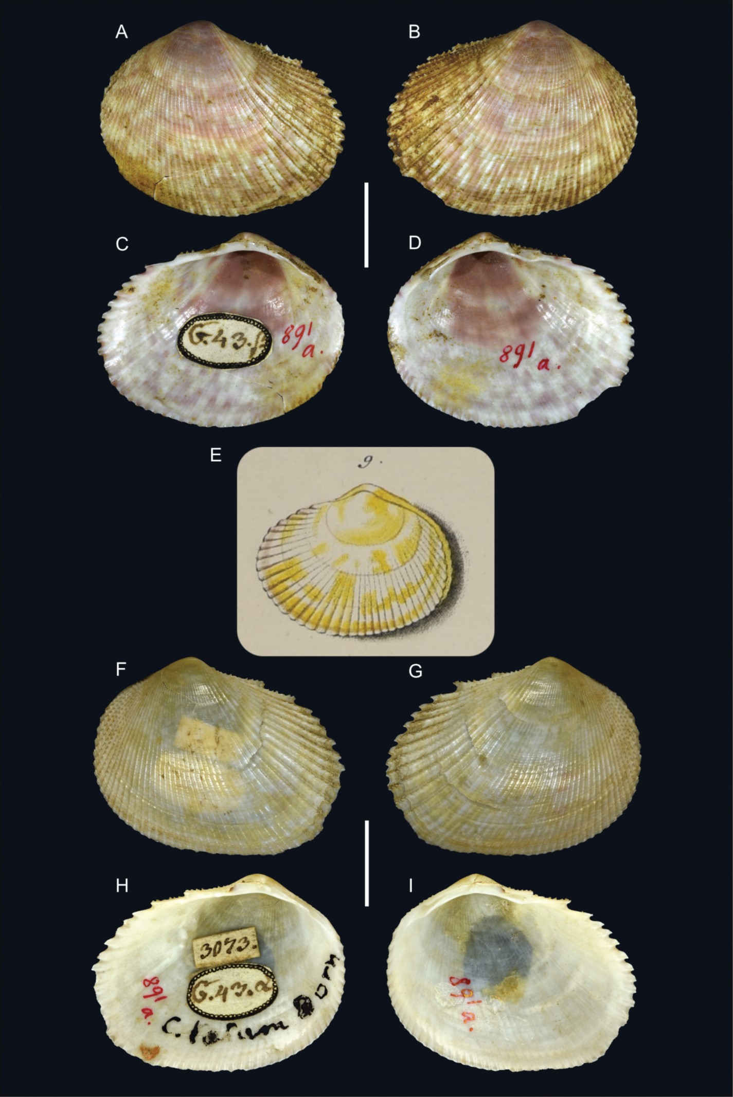 Figura: Eschner, 2025: (A–D) Lectotype de Papyridea lata. NHMW-ZOO-MO-14046, correspondente à forma β em Born 1778; (E–I) Paralectotype NHMW-ZOO-MO-14047, correspondente à forma α em Born, 1778, Plate III, No. 9