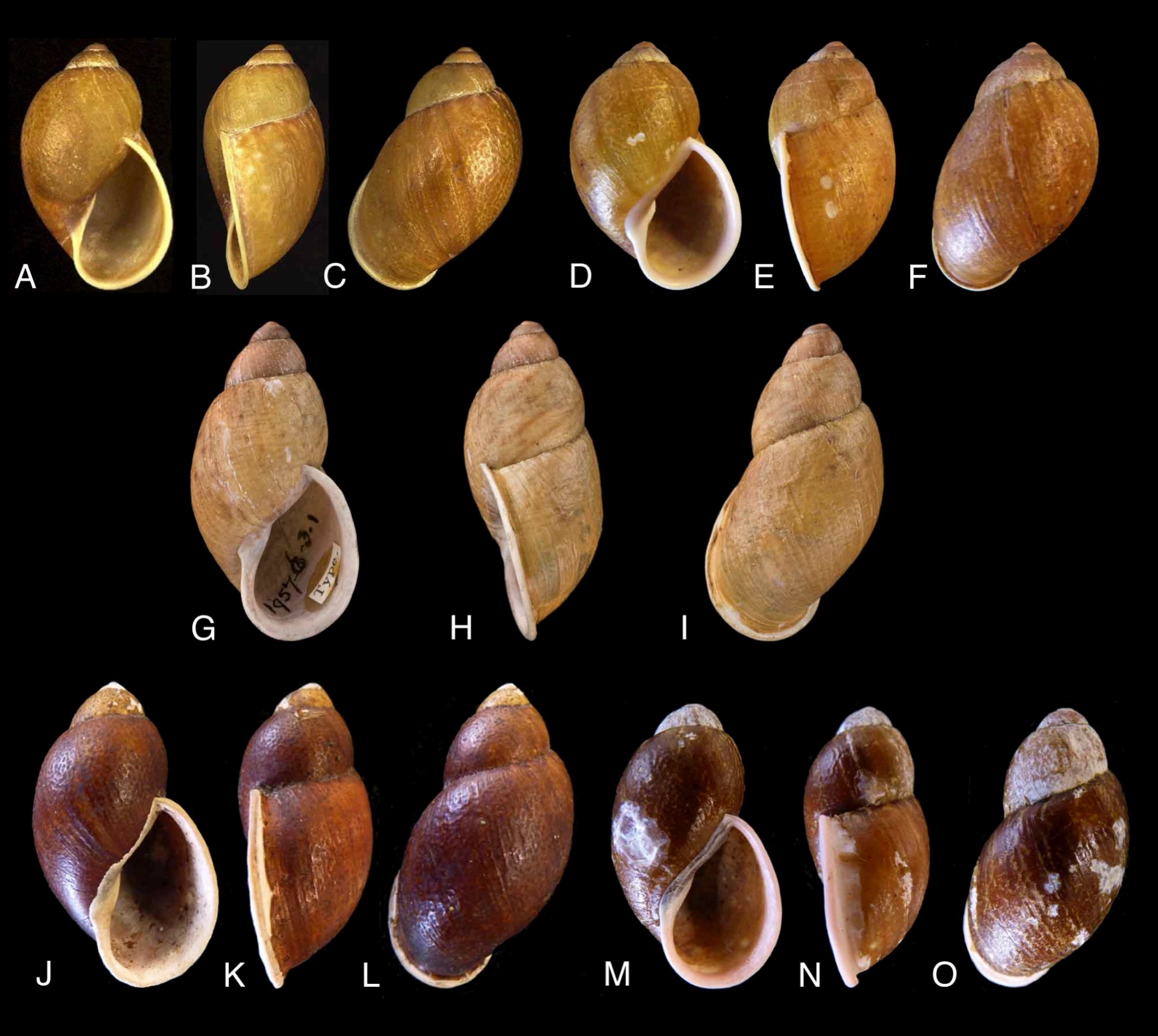 Figura: Borrero & Breure, 2011: (A–F) Plekocheilus glandiformis (Lea, 1838) , (A–C) HOLOTYPE USNM 105045 (H 33mm); (D–F) HOLOTYPE de Plekocheilus couturesi Ancey, NMW 1955.158.24074 (H 35.7 mm); (G–I) Plekocheilus taquinensis (Pfeiffer, 1855), LECTOTYPE NHMUK 1957.6.3.1 (H 40.2 mm), foto P. Crabb; (J–O) Plekocheilus bigener; (J–L) HOLOTYPE RMNH 125626 (H 38.5 mm); (M–O) PARATYPE RMNH 125627