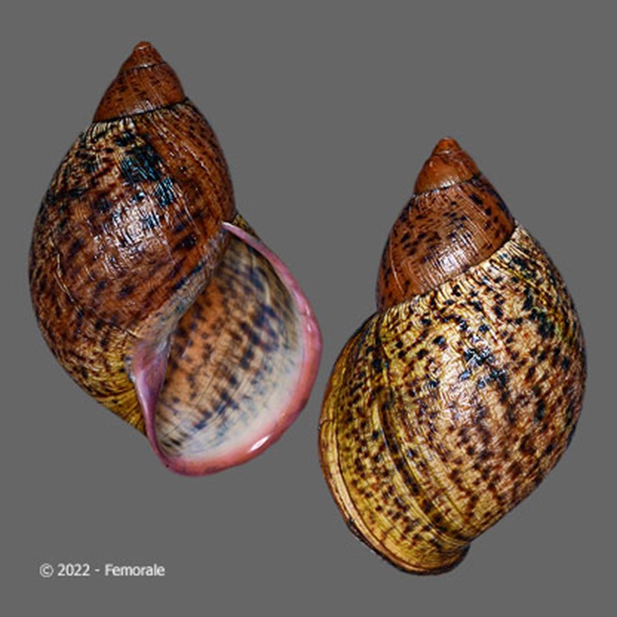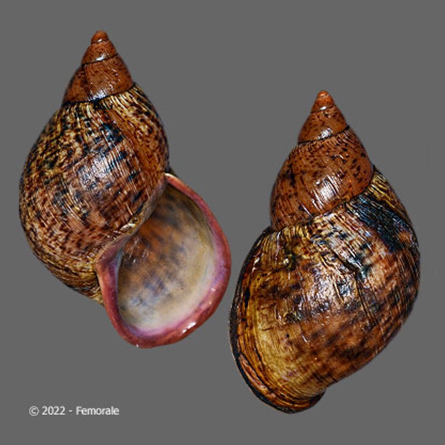Fotos: (1,2) cortesia Femorale, 2022, Colômbia; (3-5) Natural History Museum, London: LECTOTYPE de Bulimus roseolabrum Smith, 1877, NHMUK 1975135, coll Hugh Cuming, Malacatos, Sul do Equador, 42.0mm
