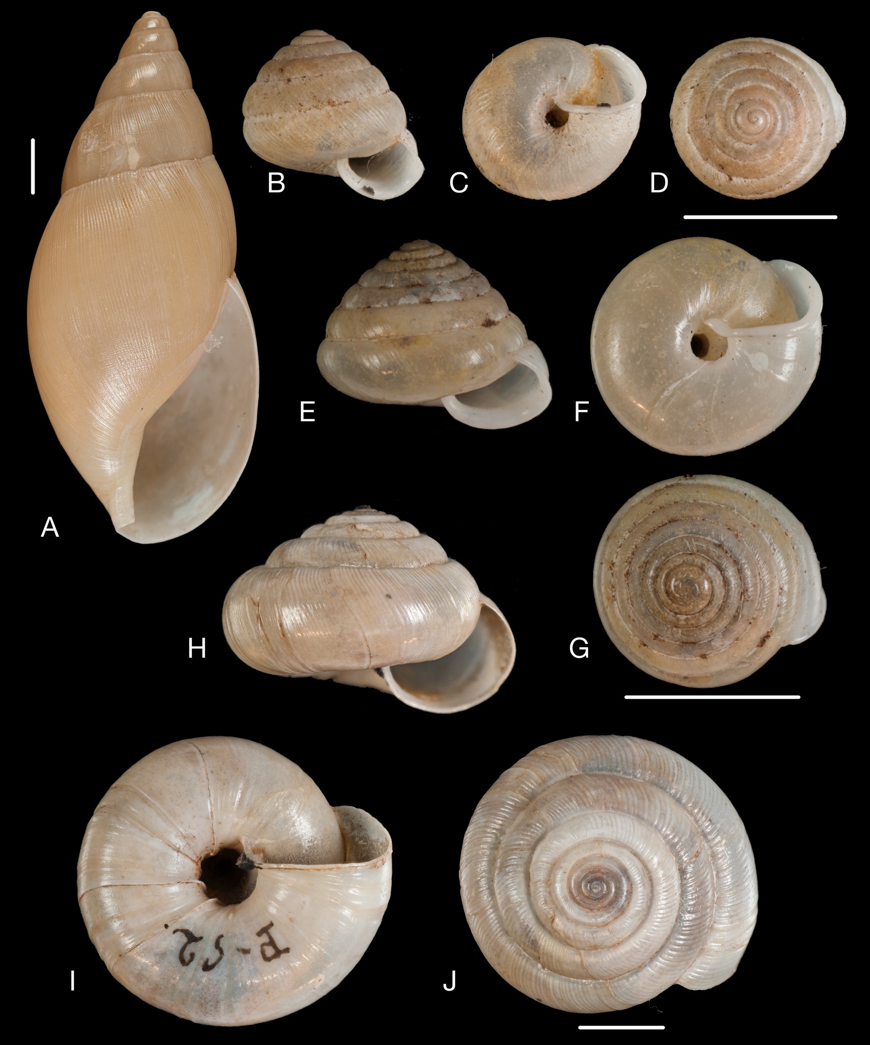 Figura: Breure & Araujo, 2017: (A) Euglandina (Cosmomenus) cumingi (Beck,1837), MNCN 15.05/76219; (B-D) Hypselartemon deshayesianus (Crosse,1863), MNCN 15.05/19843; (E-G) Hypselartemon paivanus (Pfeiffer, 1867), MNCN 15.05/20124; (H-J) Rectartemon candidus (Spix in Wagner, 1827), MNCN 15.05/20123. Linha da escala = 5 mm