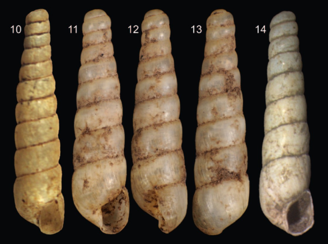 Figura: Simone & D’Ávila, 2019: (10) Rectobelus birabeni, HOLOTYPE MLP s/n, 16mm; (11-13) Rectobelus rectus, SYNTYPE ANSP 140935, 8.9mm; (14) Rectobelus levogyrus, HOLOTYPE, imagem invertida, 11.0mm