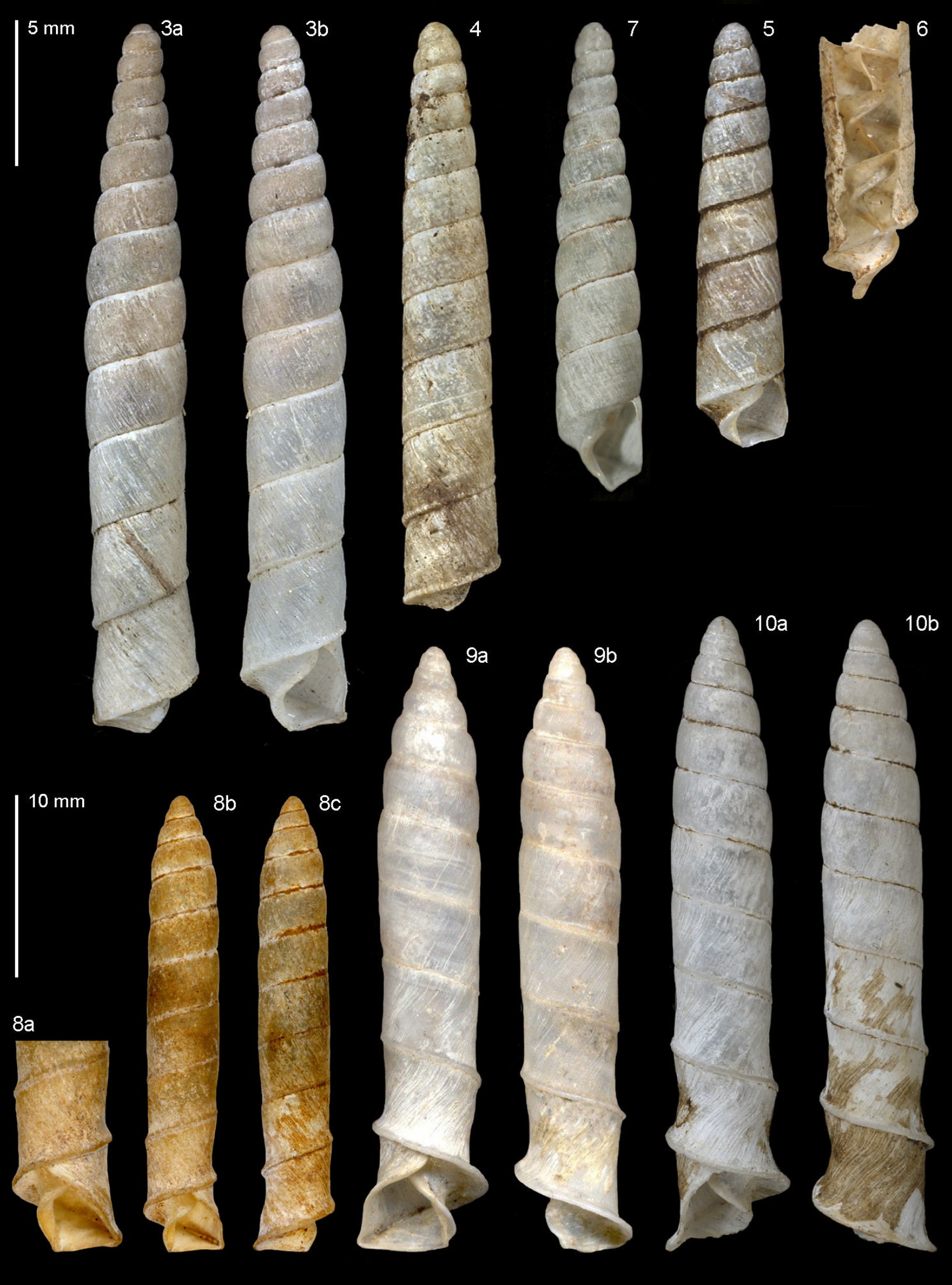 (3-6) Rhodea californica (L. Pfeiffer, 1846); 3, “form A”, syntype 1, “Monterey, California”, H=24,0 mm, NHMUK 1985092, foto Phil Crabb; (4) “form B”, Colômbia, H=20,0 mm, coll. NHMUK acc. 2176, foto Phil Crabb; (5) “form B”, El Congo, Quilichao, Cauca, Colômbia, H=19,3 mm, 19,7 mm and 14,5 mm respectivamente, NHMUK 19086230, foto Phil Crabb; (6) Colômbia, coll ANSP 78438 section, fotoPaul Callomon;