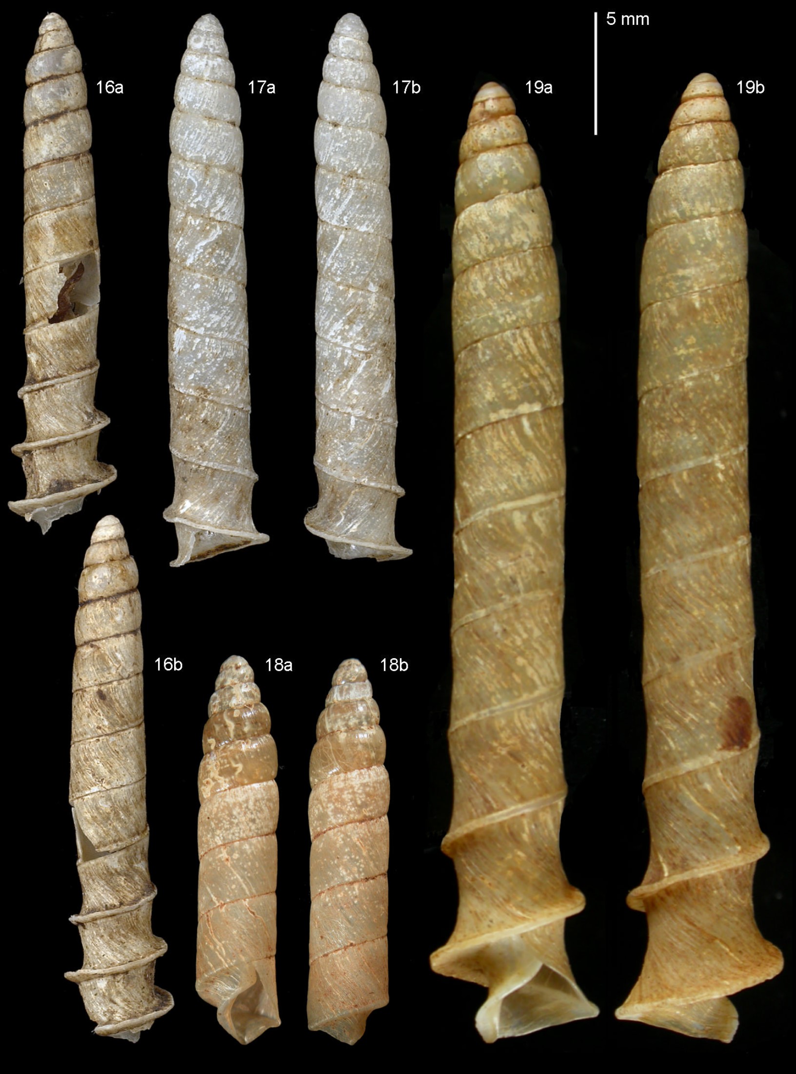 (Pilsbry, 1906: 238): “Shell narrowly and very deeply umbilicate, worm shaped, collared anteriorly with an acute spiral keel, rather thin, corneous buff, obliquely wavy striate, the apex smooth, obtusely conoid. Whorls 14, the first a little convex, the following ones flat, the rest excavated, parted by a straight carina at the suture, this carina median on the last whorl, which is excavated below it. Aperture suboblique, triangular, margin simple, columella thickened, arcuate, reaching to the base, forming a channel with the base margin.”