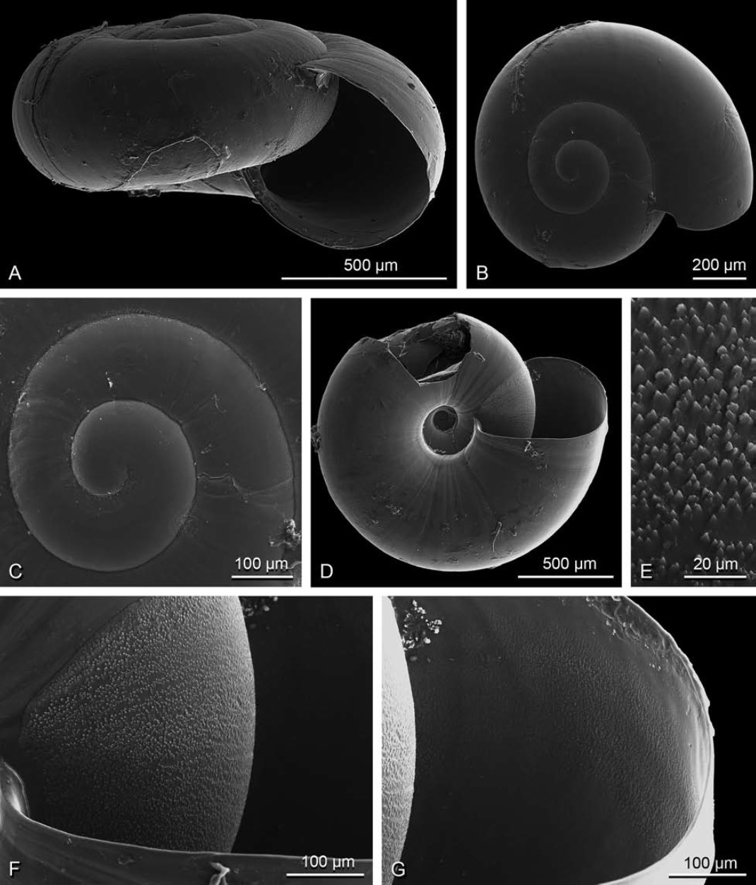 Figura: Miquel S.E. & Bungartz F. (2017): Scanning electron micrographs de Scolodonta rinae: (A) HOLOTYPE ICCDRS 40519, 1.40mm; (B,C) PARATYPE (ICCDRS 40521): (B) morfologia geral (C) detalhe da protoconcha (1.15 × 0.55 mm, 3 whorls), (D–G) detalhes do PARATYPE ICCDRS 40523