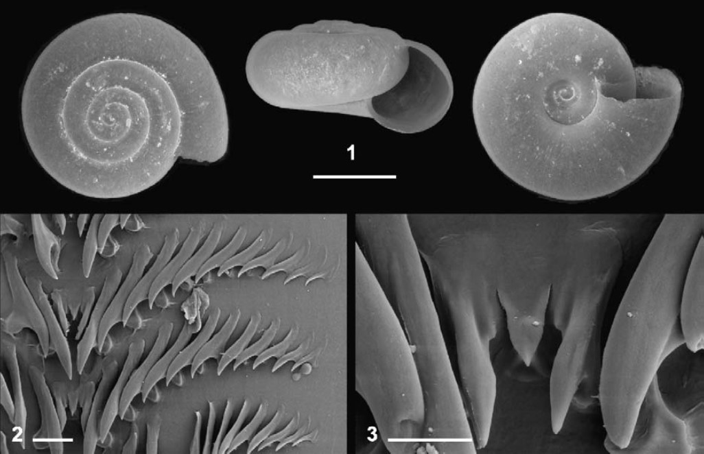 Figura: Hausdorf B. (2006): Scolodonta semperi (Doëring, 1875): (1) Argentina, Província Tucuman: Dique El Cadillal (ZMH 37572); (2-3) Argentina, Província Tucuman: Raco (ZMH 37574)