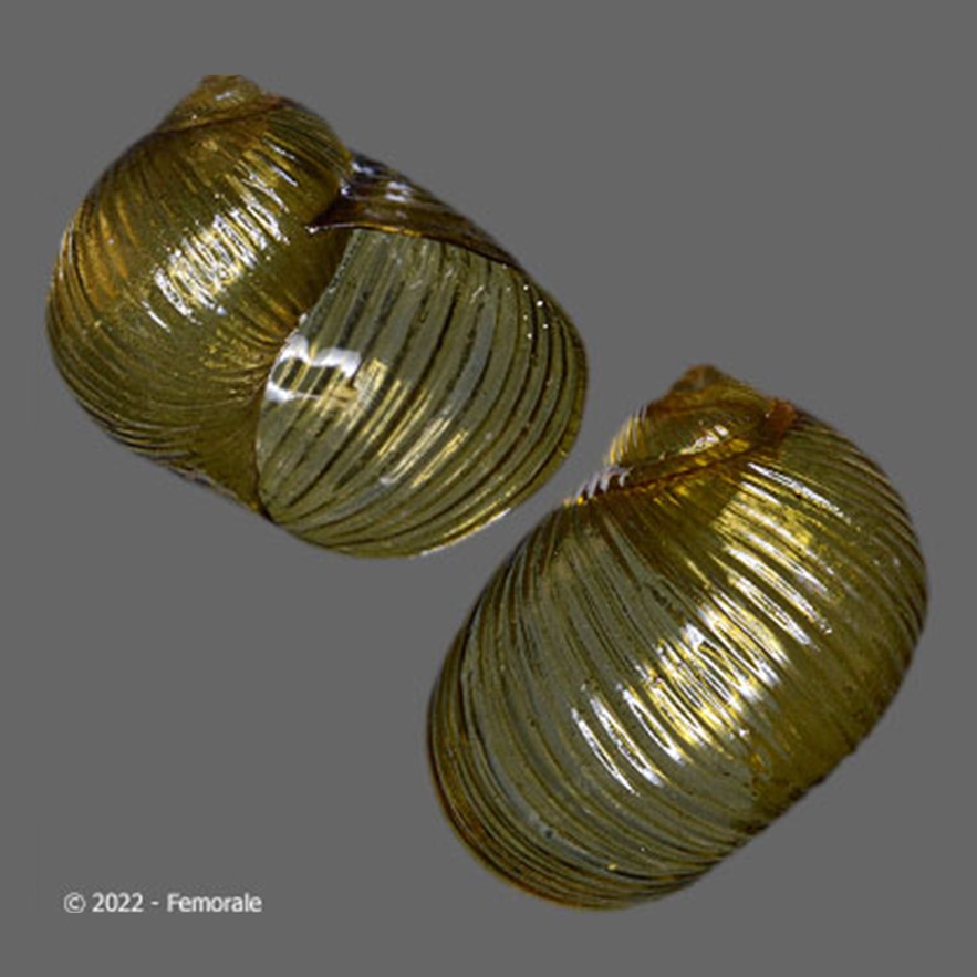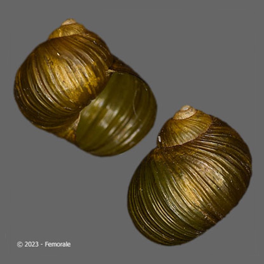 Foto: (1,2) cortesia Femorale, 2022, 15.7 e 12.7 mm; (3,4) Senckenberg Natural History Museum, Frankfurt: SYNTYPE de Simpulopsis (Simpulopsis) rufovirens (S. Moricand, 1846), SMF 302258, “Brésil, dans la province de Bahia”; (5) Natural History Museum, London: LECTOTYPE de Vitrina salomonia, NHMUK 1975485, “Salomon Island” [sic], doador: Hugh Cuming