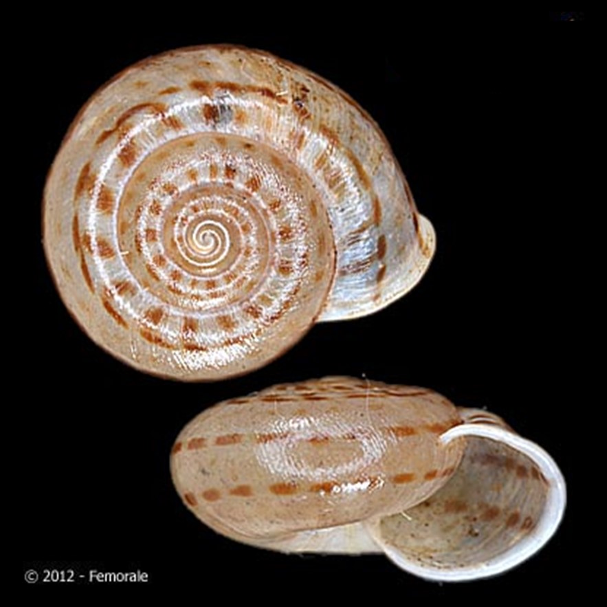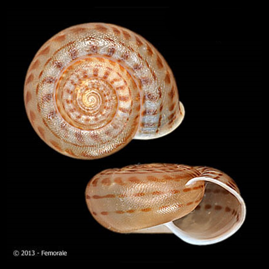 Fotos: (1,2) cortesia Femorale, 2013, 23.3 e 21.5mm respectivamente; (3,4) The Field Museum Natural History, Chicago: HOLOTYPE de Solaropsis (Psadara) monile peruviana Haas, 1951, FMNH 30928, “Perú, 800m: Urubamba Valley, Sahuayaco”, coletor: W. K. Weyrauch; (5) animal vivo: iNaturalist, observação 464129998, crédito: Esteban Diego Koch, alguns direitos reservados (CC BY-NC), 14.i.2025, “Chandles, Manoel Urbano, BR-AC, BR (Google, OSM)”