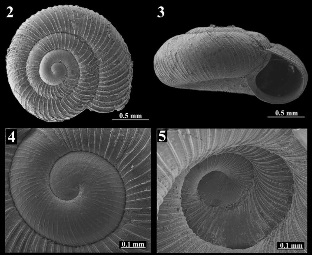 suture deep; aperture circular, descendent, about 0.72 of shell height; lip relatively thick, columellar part slightly reflected over umbilicus; callus on body whorl distinct; umbilicus widely perspective, about 0.3 of shell diameter; shell microstructure consisting of well-developed columnar prisms oriented towards external surface, of 800 nm in length (Bolmaro, pers. comm., 2012); Animal unknown.”