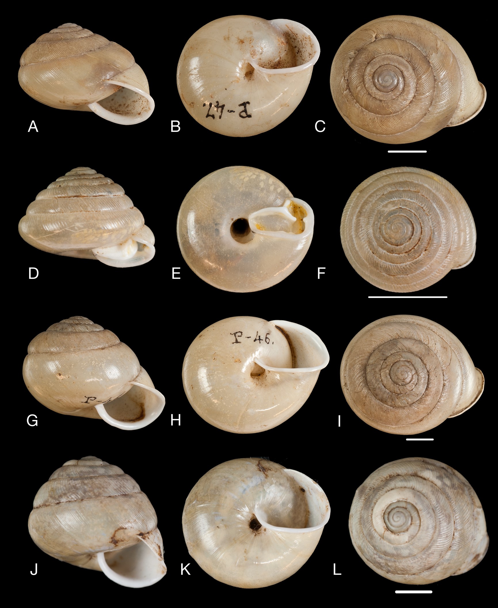 Figura: Breure & Araujo, 2017: (A-C) Streptaxis contusus (Férussac, 1821), MNCN 15.05/20178; (D-F) Streptaxis crossei (Pfeiffer,1867), MNCN 15.05/20177; (G-I) Streptaxis dunkeri (Pfeiffer in Philippi, 1845), MNCN 15.05/20117; (J-L) Streptaxis uberiformis (Pfeiffer, 1848), MNCN 15.05/20125. Linha da escala = 5 mm