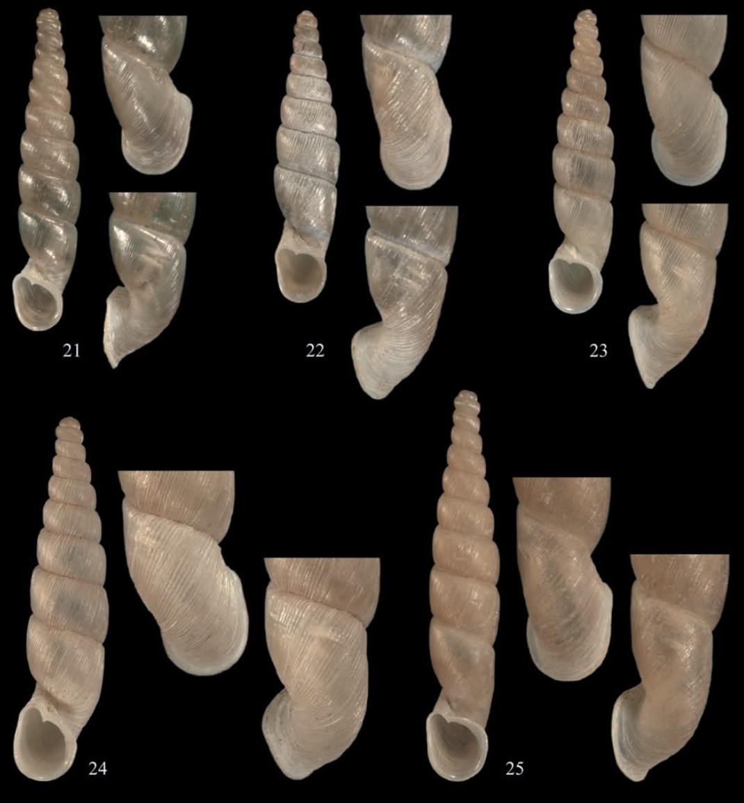 (Nordsieck, 2010): “Shell with more or less attenuated apical part, whorls rounded, protoconch broader than following whorls; yellowish-brown to -grey, in part yellowish-white; teleoconch whorls densely rib-striated, on the neck rib-striation more irregular and in part stronger; neck rounded, somewhat compressed below, subsutural swelling developed behind; aperture descending, piriform, in part more rhombic, white to yellowish-brown within, in part white, peristome hardly expanded; superior lamella of different length and height, rarely nearly missing; inferior lamella high in position, ascending with a weak spiral, mostly moderately high inwards, in front ending on or near to the columellar edge,