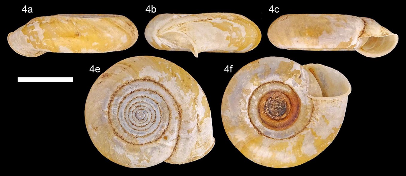 (Roosen & Dorado 2025): “Shell strongly depressed, average size for the genus, with a sunken spire; no distinction between the protoconch and teleoconch. Whorl diameter small, only slowly increasing in width, creating a maze-like appear-ance from apical view. Sculpture consists solely of growth lines and numerous indistinct axial ribs. Aperture and preceding section of whorl slightly deflected, widened, impressed from the side. In fully adult specimens, a nudge in the impression creates a small denticle on the inside of the shell. Peristome only slightly thickened and reflected. Umbilicus wide, up to 50% of total width. Colour of the per-iostracum corneous-brown, shell whitish transparent”