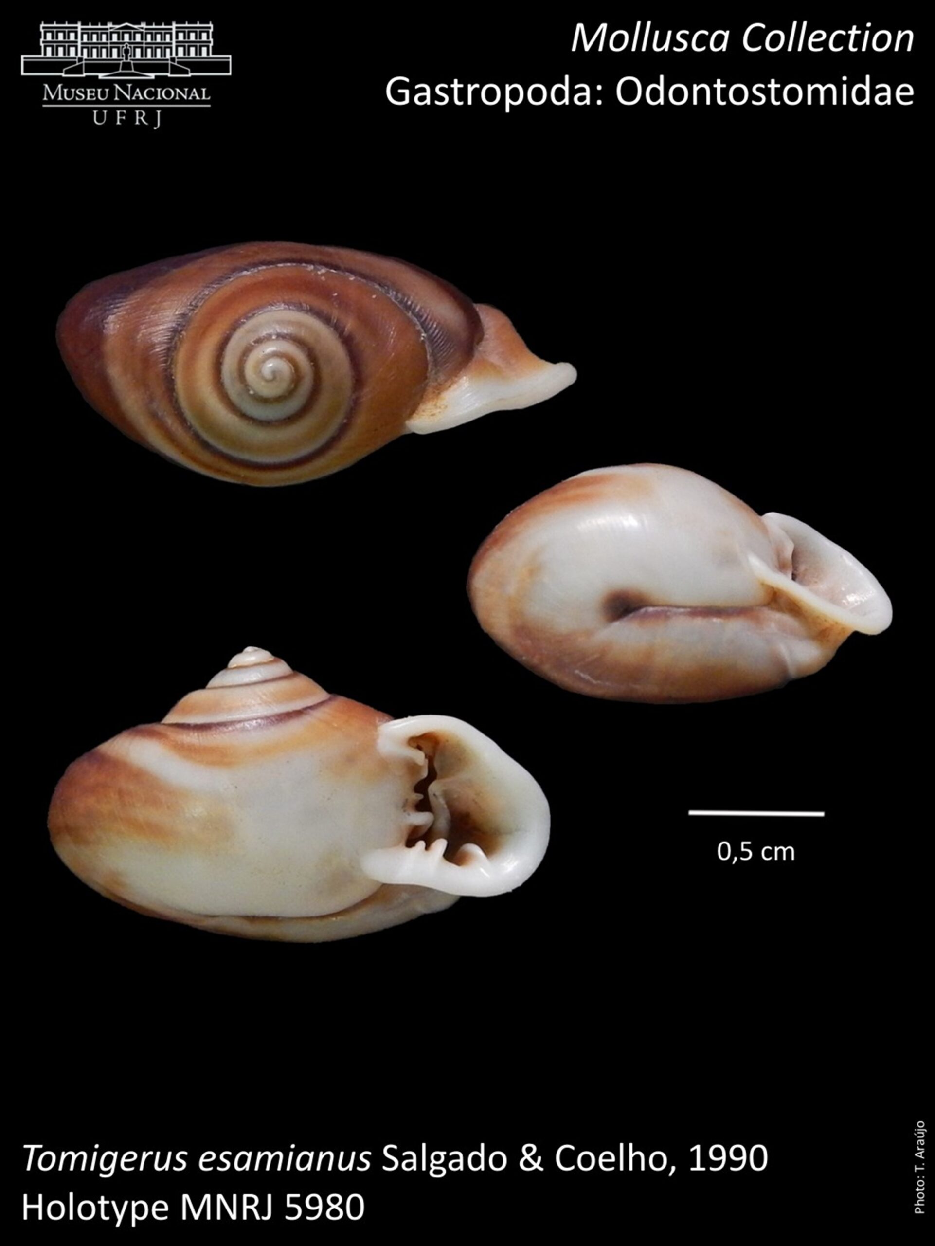 Descrição original: Salgado, N.C. & A.C.S. Coelho, 1990. Nova espécie de Tomigerus Spix, 1827. (Mollusca, Gastropoda, Bulimulidae, Odontostominae). Boletim do Museu Nacional N. S. Zoologia, Rio de Janeiro, (343): páginas 1-10, figs. 1-7