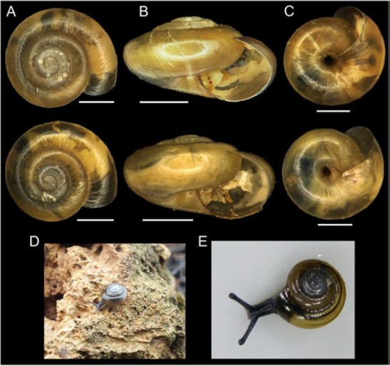 Figura: Fernandes et al. 2024: (A-C) MNRJ 61775 ; (D-E) animais vivos de Zonitoides arboreus provenientes da Ilha de Trindade Island: (D) fotografado in situ; (E) fotografado ex situ. Escala da barra = 1 mm