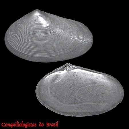 CLASSE: BIVALVIA: MARINHA FAMÍLIA: PERIPLOMATIDAE ESPÉCIE: Periploma compressum d'Orbigny, 1846 Tamanho médio: 20 - 30 mm Profundidade: 5 - 100 m Habitat: em fundos de areia lodosa Alimentação: filtrador Frequência: incomum Ocorrência no Brasil: RJ até RS Localidade Tipo: Baía de San Blas, Argentina Sinônimos: Periploma compressa Orbigny, 1846; Periploma coquettae Altena, 1968 Descrição original: Orbigny, A. D. d'. (1834-1847). Voyage dans l'Amérique méridionale (le Brésil, la république orientale de l'Uruguay, la République argentine, la Patagonie, la république du Chili, la république de Bolivia, la république du Pérou), exécuté pendant les années 1826, 1827, 1828, 1829, 1830, 1831, 1832 et 1833. Tome 5(3) Mollusques., available online at https://www.biodiversitylibrary.org/page/49211253 page(s): 514, 707 [1846]; pl. 78 figs.19-20 [1847] WoRMS: https://www.marinespecies.org/aphia.php?p=taxdetails&id=506863 Malacolog: http://www.malacolog.org/search.php?nameid=14192 Foto A:...