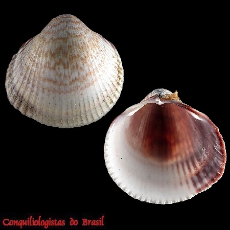 CLASSE: BIVALVIA: MARINHO FAMÍLIA: CARDIIDAE ESPÉCIE: Laevicardium brasilianum (Lamarck, 1819) Tamanho médio: 20 - 30 mm Profundidade: 0 a 75 m Habitat: em fundos arenosos (Rios 2009) Alimentação: filtrador de plâncton e outras pequenas partículas da água Frequência: comum Ocorrência no Brasil: toda costa brasileira Localidade Tipo: Brasil Sinônimos: Cardium brasilianum Lamarck, 1819; Cardium lamarckii A. d'Orbigny, 1846 Descrição original: Lamarck, [J.-B. M.] de. (1819). Histoire naturelle des animaux sans vertèbres. Tome sixième, 1re partie, vi + 343 pp. Paris, published by the author. , available online at http://www.biodiversitylibrary.org/item/47441 page(s): 5 WoRMS: https://www.marinespecies.org/aphia.php?p=taxdetails&id=381700 Malacolog: http://www.malacolog.org/search.php?nameid=12831 Foto A: Ilhabela, São Paulo. 28mm. Col. E.Schirrmeister Foto B: Itajaí, Santa Catarina. Col. C.Esteves