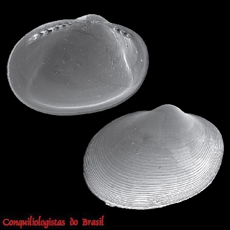 CLASSE: BIVALVIA: MARINHA FAMÍLIA: NUCULANIDAE ESPÉCIE: Nuculana concentrica (Say, 1824) Tamanho médio: 8 - 12 mm Profundidade: 0 - 90 m Habitat: enterrados em areia lodosa Alimentação: filtrador Frequência: incomum Ocorrência no Brasil: AP até ES Localidade Tipo: Nome original: Nucula concentrica Say, 1824 Sinônimos: Leda concentrica (Say, 1824); Nucula eborea Conrad, 1846 Descrição original: Say, T. (1824). An account of some of the fossil shells of Maryland. Journal of the Academy of Natural Sciences of Philadelphia. 4(1): 124-155, pls. 7-13., available online at https://www.biodiversitylibrary.org/page/24655237 page(s): 141-142, pl. 10, fig. 6 WoRMS: https://www.marinespecies.org/aphia.php?p=taxdetails&id=420665 Malacolog: http://www.malacolog.org/search.php?nameid=11700 Foto A: Brasil. 8,5 mm. Femorale