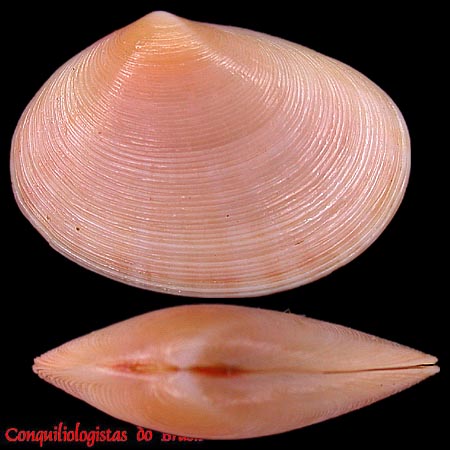 CLASSE: BIVALVIA: MARINHO FAMÍLIA: SEMELIDAE ESPÉCIE: Abra braziliensis (E. A. Smith, 1885) Tamanho médio: 16 - 22 mm Profundidade: 150 - 640 m Habitat: em fundos arenosos Alimentação: filtrador Frequência: incomum Ocorrência no Brasil: nordeste até RJ Localidade tipo: Pernambuco, Brasil Sinônimo: Semele braziliensis E. A. Smith, 1885 Descrição original: https://www.biodiversitylibrary.org/page/1108226#page/17/mode/1up WoRMS: https://www.marinespecies.org/aphia.php?p=taxdetails&id=507226 Malacolog: http://www.malacolog.org/search.php?nameid=13011 Foto A e B: Arraial do Cabo, RJ. 22 mm. Col. S.Vanin