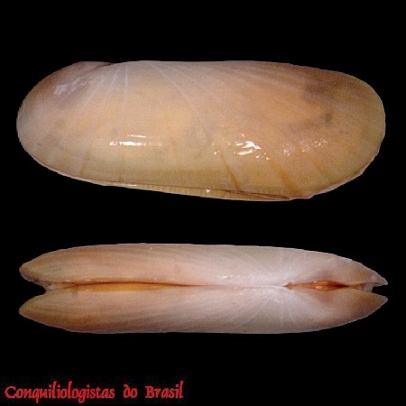 CLASSE: BIVALVIA: MARINHO FAMÍLIA: SOLEMYIDAE ESPÉCIE: Acharax patagonica (E. A. Smith, 1885) Tamanho médio: 12 - 40 mm Profundidade: 124 - 440 m Habitat: em lodo Alimentação: filtrador Frequência: incomum Ocorrência no Brasil: ES até RS Localidade tipo: Patagônia Sinônimos: Solemya patagonica E. A. Smith, 1885; Solemya macrodactyla Mabille & Rochebrune, 1889 Descrição original: Smith, E. A. (1885). Report on the Lamellibranchiata collected by H.M.S. Challenger during the years 1873-76. Report on the Scientific Results of the Voyage of H.M.S. Challenger during the years 1873–76, Zoology 13 (part 35): 1-341, pls. 1-25. , available online at https://www.biodiversitylibrary.org/page/1108226 page(s): 208, pl. 11, figs 1, 1a. WoRMS: https://www.marinespecies.org/aphia.php?p=taxdetails&id=507120 Malacolog: http://www.malacolog.org/search.php?nameid=11843 Foto A: Guarapari, Espírito Santo. 38 mm. Col. S.Vanin ...