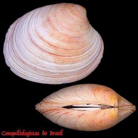 CLASSE: BIVALVIA: MARINHO FAMÍLIA: VENERIDAE ESPÉCIE: Tivela zonaria (Lamarck, 1818) Tamanho médio: 55 - 75 mm Profundidade: 0 - 2 m Habitat: em areia Alimentação: filtrador Frequência: comum Ocorrência no Brasil: ES até RS Localidade Tipo: não designada Sinônimos: Tivela ventricosa (Gray, 1838); Cytherea zonaria Lamarck, 1818, Trigona ventricosa Gray, 1838 Descrição original: Lamarck, [J.-B. M.] de. (1818). Histoire naturelle des animaux sans vertèbres. Tome cinquième, 612 pp. Paris, Deterville/Verdière. , available online at http://biodiversitylibrary.org/page/12886879 page(s): 562 WoRMS: https://www.marinespecies.org/aphia.php?p=taxdetails&id=507958 Malacolog: http://www.malacolog.org/search.php?mode=details&waspid=16285 Foto A e B: Itajaí, Santa Catarina. ~65 mm. Col. C.Esteves