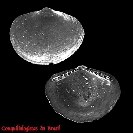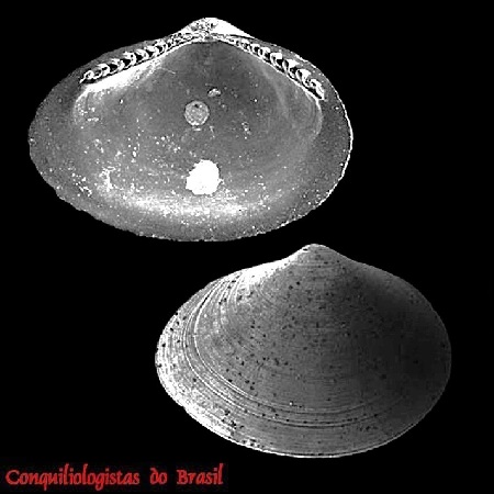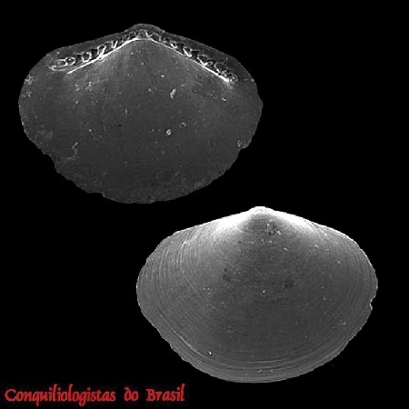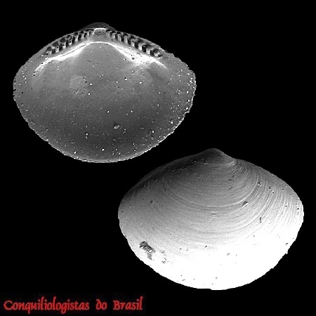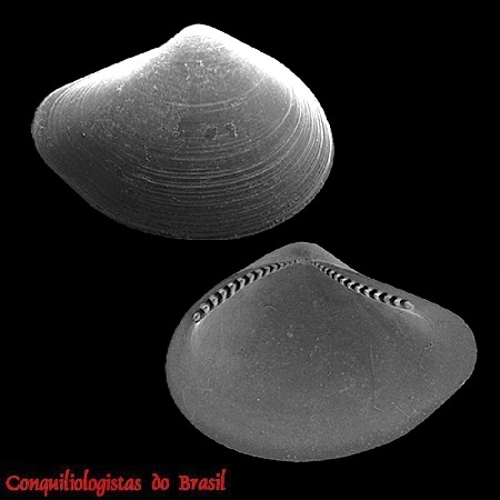 CLASSE: BIVALVIA: MARINHO FAMÍLIA: YOLDIIDAE ESPÉCIE: Yoldiella riograndensis (Esteves, 1984) Tamanho médio: ~4 mm Profundidade: 111 - 153 m Habitat: areia lamacenta com biodetritos; argila siltosa com biodetritos Alimentação: material orgânico do sedimento Frequência: rara Ocorrência no Brasil: SP até RS Localidade Tipo: Sul do Brasil Sinônimo: Yoldia (Yoldia) riograndensis Esteves, 1984 Descrição original: Forti Esteves, I. R. (1984). Recent bivalves (Palaeotaxodonta and Pteriomorphia) from the Brazilian continental shelf. Pesquisas [Porto Alegre]. 16: 190-226. page(s): 196, pl. 3 figs 28-31 WoRMS: https://www.marinespecies.org/aphia.php?p=taxdetails&id=506491 Foto A: HOLÓTIPO - Sul do Brasil. 4 mm. Forti Esteves, I. R. (1984). MORG 21.145 – Museu Oceanográfico da Fundação Universidade do Rio Grande do Sul
