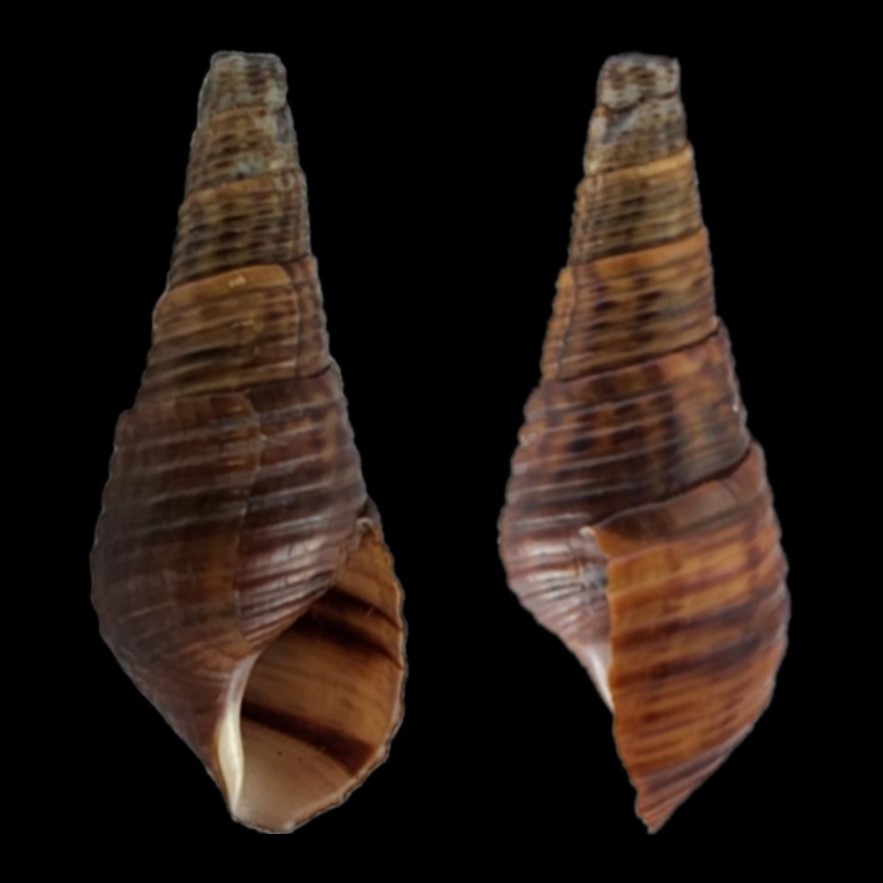 CLASSE: GASTROPODA: ÁGUA DOCE FAMÍLIA: HEMISINIDAE ESPÉCIE: Aylacostoma brunneum Vogler & Peso, 2014 Tamanho médio: 28 mm Habitat: Rios e riachos Ocorrência: Ato Rio Paraná, entre Argentina e Paraguai Localidade tipo: Paraguai Nome original: Aylacostoma brunneum Vogler & Peso, 2014 Comentários: Espécie considerada Extinta (EX), Foi descrita a partir de exemplares em cativeiro incluídos no programa de conservação ex situ "Projeto Aylacostoma" desenvolvido na Universidade Nacional de Misiones. Os exemplares procediam de populações do Alto Paraná que foram extintos após a finalização do processo de enchimento da barragem de Yacyretá em 2011, que modificaram drasticamente seus habitats. Atualmente não há exemplares vivos nesse programa de conservação, por isso foi considerada extinta (Peso et al. 2025) Descrição: Peso et al. 2025: "Concha...