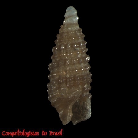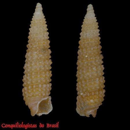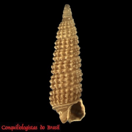 CLASSE: GASTROPODA: MARINHO FAMÍLIA: CERITHIOPSIDAE ESPÉCIE: Cerithiopsis nimia Pimenta, Garofalo, Figueira & M. Fernandes, 2024 Tamanho médio: 2,5 – 4 mm Profundidade: 26 a 149 metros Habitat: Alimentação: carnívoro Frequência: comum Ocorrência no Brasil: ES e RJ Localidade Tipo: off Rio de Janeiro, Bacia de Campos, Brasil Nome original: Cerithiopsis nimia Pimenta, Garofalo, Figueira & M. Fernandes, 2024 Etimologia: do latim nimius = muito, excessivo. Esta espécie recebe este nome devido à sua abundante ocorrência no material estudado Descrição original: https://mapress.com/zt/article/view/zootaxa.5494.1.1 WoRMS: https://www.marinespecies.org/aphia.php?p=taxdetails&id=1766816 Molluscabase: https://www.molluscabase.org/aphia.php?p=taxdetails&id=1766816 Foto A: off Rio de Janeiro, Bacia de Campos. 2,7 mm. Parátipo MNRJ 16261. Alexandre Dias Pimenta, Raquel Garofalo de Souza Faria, Raquel Medeiros Andrade Figueira & Maurício Romulo Fernandes (2024). Unraveling another of the ‘Big Fiveʹ: new species and records of...