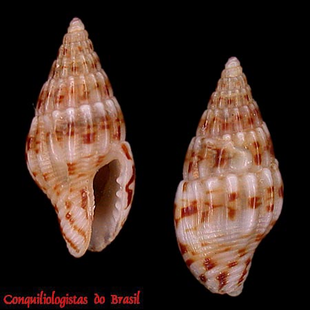 CLASSE: GASTROPODA: MARINHO FAMÍLIA: COLUMBELLIDAE ESPÉCIE: Eurypyrene ledaluciae (Rios & Tostes, 1981) Tamanho médio: 20 - 27 mm Profundidade: 80 m Habitat: rochas e algas Alimentação: carnívoro Frequência: rara Ocorrência no Brasil: RJ Localidade Tipo: Maricá, Rio de Janeiro, Brasil Etimologia: Homenagem às esposas dos autores, Leda e Lucia. Sinônimos: Pyrene ledaluciae Rios & Tostes, 1981; Conella ledaluciae (Rios & Tostes, 1981) Descrição original: https://www.biodiversitylibrary.org/page/8497245#page/206/mode/1up WoRMs: https://www.marinespecies.org/aphia.php?p=taxdetails&id=747305 Malacolog: http://www.malacolog.org/search.php?nameid=4438 Foto A: Cabo Frio, RJ. 21 mm. Femorale Foto B: Cabo Frio, RJ. 24 mm. Col. C.Henckes Parátipo 3900 MNRJ https://ala-hub.sibbr.gov.br/ala-hub/occurrences/2d1e7a24-5893-4ed8-bb44-a21ca8bb28b5