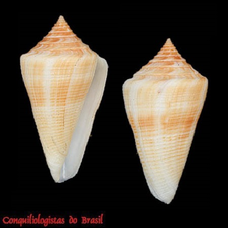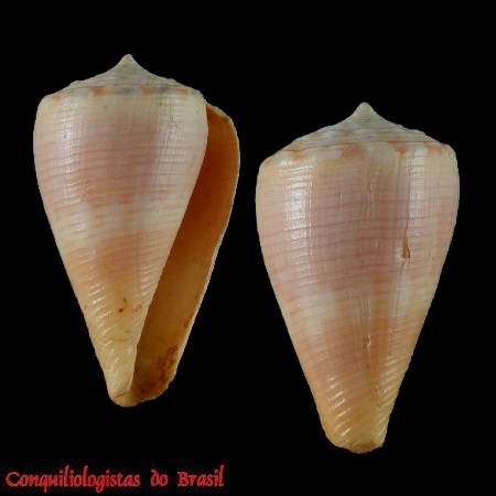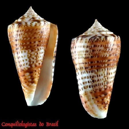 CLASSE: GASTROPODA: MARINHO FAMÍLIA: CONIDAE ESPÉCIE: Conus brunneobandatus Petuch, 1992 Tamanho médio: 25 - 40 mm Profundidade: 20 - 80 metros Habitat: em fundos areno-lodosos Alimentação: carnívoro Frequência: rara Ocorrência no Brasil: AP até RN Localidade Tipo: off Tobejuba, Boca Araguao, delta do Rio Orinoco, Venezuela Sinônimos: Dauciconus brunneobandatus (Petuch, 1992); Conasprelloides brunneobandatus (Petuch, 1992) Descrição original: Petuch, E. J. (1992). Molluscan discoveries from the tropical western Atlantic. Part 1. New species of Conus from the Bahamas platform, Central American and northern South American coasts and the Lesser Antilles. La Conchiglia. 23(264): 36-40. page(s): 37-38, figs 3-4 WoRMS: https://www.marinespecies.org/aphia.php?p=taxdetails&id=429343 Malacolog: http://www.malacolog.org/search.php?nameid=6087 Foto A: off Amapá. 31,2 mm. Col. E.Schirrmeister