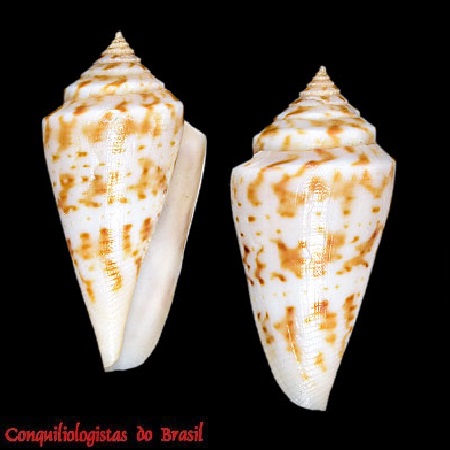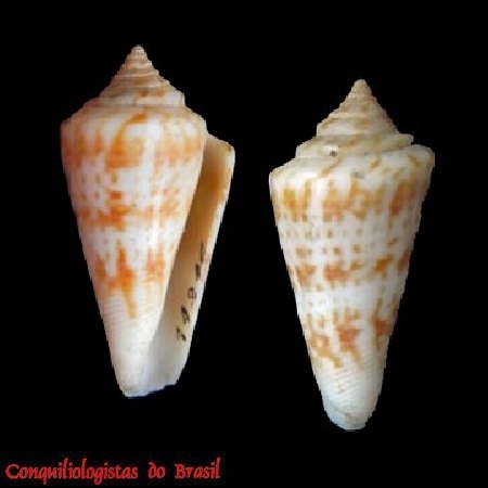 CLASSE: GASTROPODA: MARINHO FAMÍLIA: CONIDAE ESPÉCIE: Conasprella toincabrali (Petuch & Berschauer, 2019) Tamanho médio: 14 - 17 mm Profundidade: 10 m Habitat: em fundos de algas coralinas Alimentação: carnívoro Frequência: incomum Ocorrência no Brasil: AP até RN Localidade Tipo: off Tibau do Sul, Rio Grande do Norte, Brasil Etimologia: homenagem a Antonio (Toin) José Cabral, pescador de lagostas que coletou os epecimes para a descrição Sinônimo: Jaspidiconus toincabrali Petuch & Berschauer, 2019 Descrição original: Petuch, E. J.; Berschauer, D. P. (2019). New species of mollusks (Gastropoda and Bivalvia) from the tropical western Atlantic, West Africa, and Red Sea. The Festivus. 51(3): 218-230 [running head 51(2) in error]. page(s): 225, figs 2G-H WoRMS: https://www.marinespecies.org/aphia.php?p=taxdetails&id=1363639 Foto A: off Tibau do Sul, Rio Grande do Norte. 14...