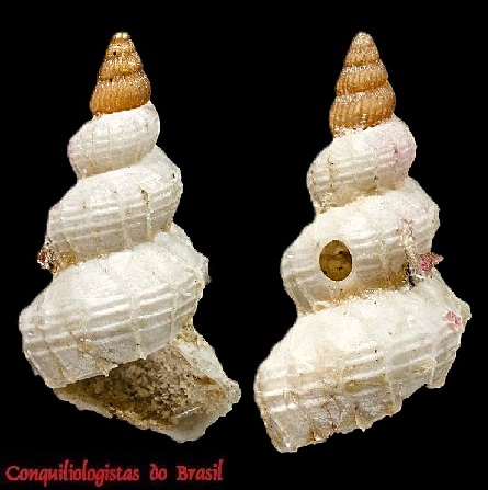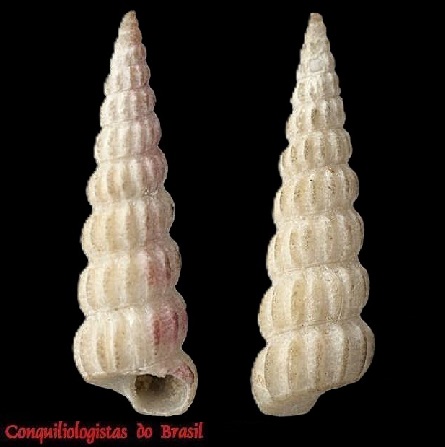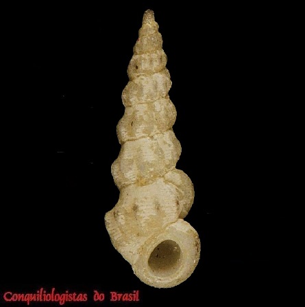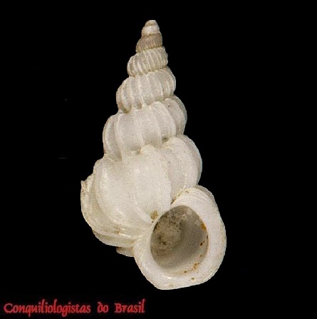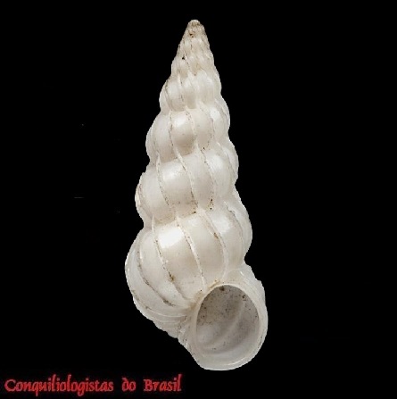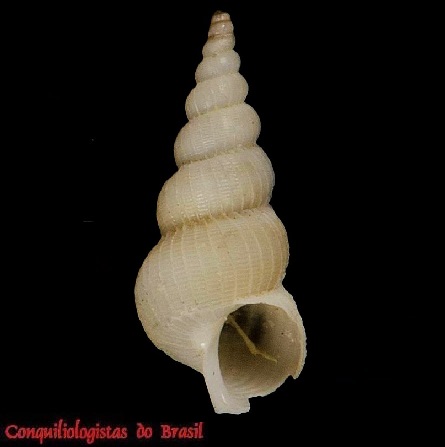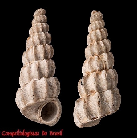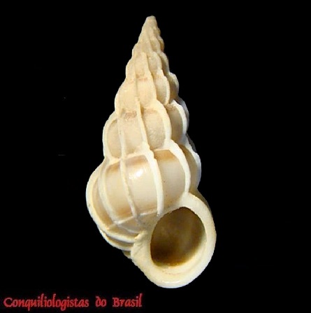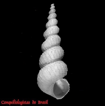 CLASSE: GASTROPODA: MARINHO FAMÍLIA: EPITONIIDAE ESPÉCIE: Epitonium babylonia (Dall, 1889) Tamanho médio: 15 - 30 mm Profundidade: 30 - 1337 m Habitat: areia lodosa Alimentação: carnivoro Frequência: incomum Ocorrência no Brasil: CE até PE e SP Localidade Tipo: Carolina do Sul, EUA Sinônimos: Scala babylonia Dall, 1889 Descrição original: Não documentada WoRMs: https://www.marinespecies.org/aphia.php?p=taxdetails&id=566950 Malacolog: http://www.malacolog.org/search.php?nameid=3384 Foto A: São Sebastião, SP. 17 mm. Col. S.Vanin