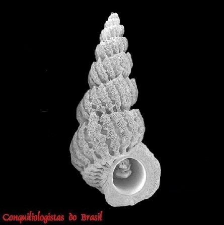 CLASSE: GASTROPODA: MARINHO FAMÍLIA: EPITONIIDAE ESPÉCIE: Epitonium hispidulum (Monterosato, 1874) Tamanho médio: 2 - 3,5 mm Profundidade: 120 - 1550 m Habitat: Alimentação: carnivoro Frequência: rara Ocorrência no Brasil: RJ Localidade Tipo: Palermo, Sicilia, Itália Sinônimo: Scalaria hispidula Monterosato, 1874 Descrição original: Monterosato, T. A. di. (1874). Recherches conchyliologiques, effectuées au Cap Santo Vito, en Sicile. Journal de Conchyliologie. 22(3): 243-282 [August 1st, 1874]., available online at http://biodiversitylibrary.org/page/15661963 page(s): 264 Referência: Andrade, Bruno Garcia. Revisão taxonômica das famílias Epitoniidae e Nystiellidae (Mollusca, Gastropoda, Epitonioidea) nas províncias Tropical e Temperada do Atlântico sudoeste. Rio de Janeiro. UFRJ, Museu Nacional. 2017, xxxix + 467 pp WoRMS: https://www.marinespecies.org/aphia.php?p=taxdetails&id=139726 Foto A: off Rio de Janeiro. 2,09 mm. IBUFRJ 17072 - Instituto de Biologia...