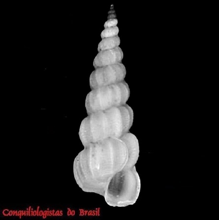 CLASSE: GASTROPODA: MARINHO FAMÍLIA: EPITONIIDAE ESPÉCIE: Cylindriscala acus (R. B. Watson, 1883) Tamanho médio: 4 - 13 mm Profundidade: 30 - 713 m Habitat: areia e cascalho Alimentação: carnivoro Frequência: rara Ocorrência no Brasil: RJ Localidade Tipo: Azores Sinônimos: Scala fulgens de Boury, 1909; Scalaria solidula Monterosato, 1875; Opalia acus (Watson, 1883); Scalaria acus Watson, 1883; Scala monterosatoi de Boury, 1890; Scala parcicostata Dautzenberg & de Boury, 1897 Descrição original: https://www.biodiversitylibrary.org/item/99383#page/7/mode/1up WoRMs: https://www.marinespecies.org/aphia.php?p=taxdetails&id=139701 Malacolog: http://www.malacolog.org/search.php?nameid=3356 Foto A: Cabo Frio, RJ. 4 mm. Col. S.Vanin