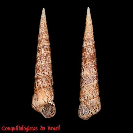 CLASSE: GASTROPODA: MARINHO FAMÍLIA: TURRITELLIDAE ESPÉCIE: Caviturritella variegata (Linnaeus, 1758) Tamanho médio: 60 - 90 mm Profundidade: 0 - 53 m Habitat: fundos de areia Alimentação: herbívoro Frequência: incomum Ocorrência no Brasil: AP Localidade Tipo: desconhecida Sinônimos: Epitonium imbricata (Linnaeus, 1758); Turbo imbricatus Linnaeus, 1758; Turbo terebra auct. non Linnaeus, 1758; Haustator variegata (Linnaeus, 1758); Turbo variegatus Linnaeus, 1758; Epitonium marmoreum Röding, 1798; Turritella elongata Reeve, 1849 Descrição original: Linnaeus, C. (1758). Systema Naturae per regna tria naturae, secundum classes, ordines, genera, species, cum characteribus, differentiis, synonymis, locis. [The system of nature through the three kingdoms of nature, according to classes, orders, genera, species, with characters, differences, synonyms, places.]. Impensis Direct. Laurentii Salvii. Holmiae [Stockholm]. 1(10) [iii], 824 p., available online at https://biodiversitylibrary.org/page/726886 WoRMS: https://www.marinespecies.org/aphia.php?p=taxdetails&id=1672421#images Malacolog: http://www.malacolog.org/search.php?nameid=1320 Foto A: off Amapá. 5°32'36.6"N 50°44'54.2"W. 30-80 m.prof. 73 mm. Femorale ...