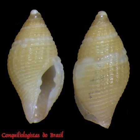 CLASSE: GASTROPODA: MARINHO FAMÍLIA: RAPHITOMIDAE ESPÉCIE: Mioawateria extensa (Dall, 1881) Tamanho médio: 6 - 10 mm Profundidade: 430 - 1830 metros Habitat: fundos de areia lodosa Alimentação: carnívoro Frequência: raro Ocorrência no Brasil: RJ Localidade Tipo: off Cape San Antonio Sinônimos: Gymnobela extensa (Dall, 1881); Pleurotoma extensa Dall, 1881; Pleurotomella extensa (Dall, 1881); Pleurotoma streptophora Watson, 1881; Gymnobela judithae Clarke, 1989 Descrição original: https://www.biodiversitylibrary.org/page/6353276#page/41/mode/1up WoRMS: https://www.marinespecies.org/aphia.php?p=taxdetails&id=722476 Malacolog: http://www.malacolog.org/search.php?nameid=6757 Foto A: off Cabo Frio, Rio de Janeiro. 430-450 m prof. 8 mm. Col. S.Vanin