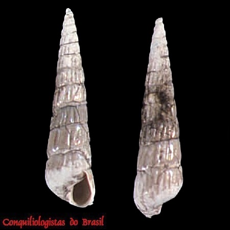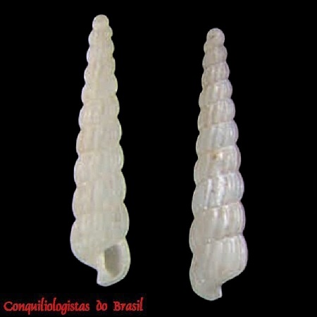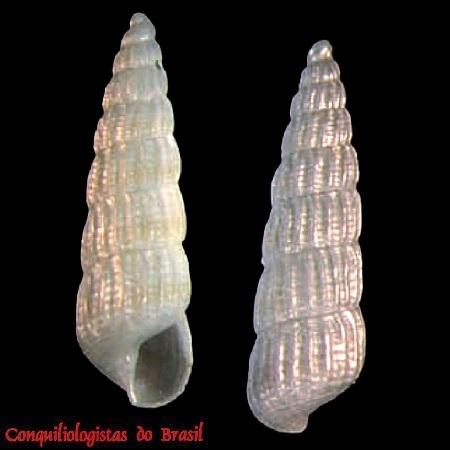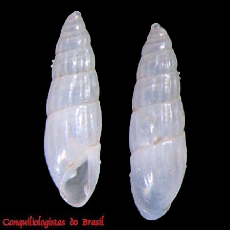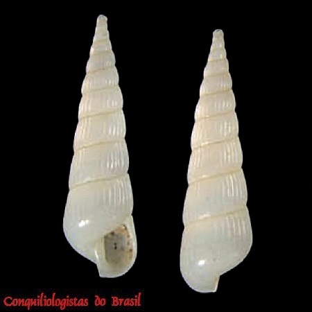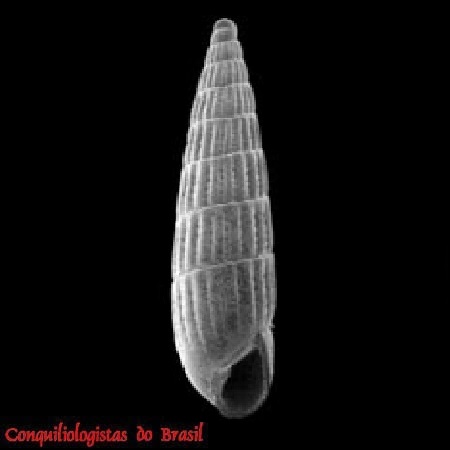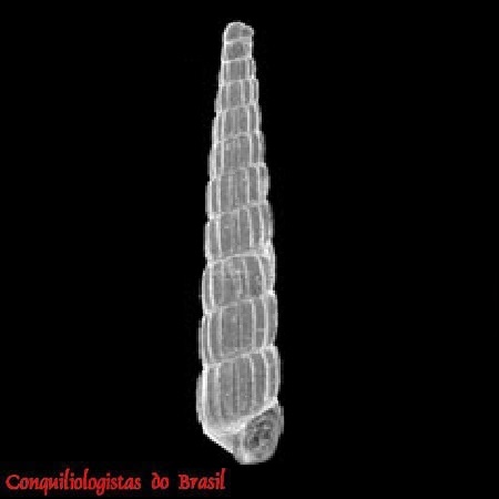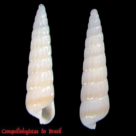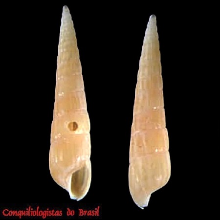 CLASSE: GASTROPODA: MARINHO FAMÍLIA: PYRAMIDELLIDAE ESPÉCIE: Turbonilla brasiliensis Clessin, 1902 Tamanho médio: 10 mm Profundidade: 48 a 56 m Habitat: em fundos de areia e cascalho Alimentação: carnívoro Frequência: incomum Ocorrência no Brasil: PE até RS Localidade Tipo: Sul do Brasil Sinônimos: Turbonilla interrupta auct. non Totten, 1835; Turbonilla iheringi Clessin, 1900; Turbonilla clessini Ihering, 1907 Referência: Clessin, S. 1900. Die Familie der Eulimidae Systematisches Conchylien-Cabinet 1(28) 41-224, pl. 10-36. WoRMs: https://www.marinespecies.org/aphia.php?p=taxdetails&id=533546 Malacolog: http://www.malacolog.org/search.php?nameid=10973 Foto A: Espírito Santo. 9 mm. Col. S.Vanin