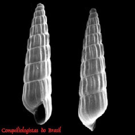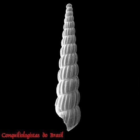 CLASSE: GASTROPODA: MARINHO FAMÍLIA: PYRAMIDELLIDAE ESPÉCIE: Chrysallida nioba (Dall & Bartsch, 1911) Tamanho médio: 2,5 - 3,5 mm Profundidade: 37 - 140 m Habitat: em fundos arenosos Alimentação: carnívoro Frequência: incomum Ocorrência no Brasil: RJ Localidade Tipo: Bermuda Sinônimo: Odostomia (Chrysallida) nioba Dall & Bartsch, 1911 Descrição original: Dall, W. H. & Bartsch, P. (1911). New species of shells from Bermuda. Proceedings of the United States National Museum. 40: 277-288, pl. 35., available online at https://www.biodiversitylibrary.org/page/15845507 Referência: Pimenta A. D. (2012) Four new species and two new records of Odostomiinae (Gastropoda: Pyramidellidae) from Brazil. Zoologia (Curitiba) 29(5): 439–450. [October 2012]., available online at https://doi.org/10.1590/S1984-46702012000500007 WoRMS: https://www.marinespecies.org/aphia.php?p=taxdetails&id=420441 Malacolog: http://www.malacolog.org/search.php?nameid=7401 Foto A: off Rio de Janeiro. 2,68 mm. IBUFRJ 11333 - Instituto de...