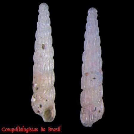 CLASSE: GASTROPODA: MARINHO FAMÍLIA: PYRAMIDELLIDAE ESPÉCIE: Turbonilla cf. riisei (Mörch, 1875) Tamanho médio: 4 - 6 mm Profundidade: 11 - 56 m Habitat: Alimentação: carnívoro Frequência: rara Ocorrência no Brasil: AP, PA, BA até RJ Localidade Tipo: Saint Thomas, Ilhas Virgens Americanas Sinônimos: Chemnitzia riisei Mörch, 1875; Pyrgiscus riisei (Mörch, 1875); Turbonilla pilsbryi Bush, 1899; Pyrgiscus pilsbryi (Bush, 1899) Etimologia: homenagem a Albert Heinrich Riise (1810-1882), farmaceutico dinamarquês e fabricante de Rum no Caribe Descrição original: Mörch, O. A. L. (1875). Synopsis molluscorum marinorum Indiarum occidentalium imprimis insularum danicarum. Malakozoologische Blätter. 22: 142-184., available online at http://biodiversitylibrary.org/page/15919003 page(s): 165 Referência: Pimenta A.D. & Absalão R.S. (2004). Fifteen new species and ten new records of Turbonilla Risso, 1826 (Gastropoda, Heterobranchia, Pyramidellidae) from Brazil. Bollettino Malacologico. 39 (5-8): 113-140., available online at http://www.societaitalianadimalacologia.it/Bollettino/Bollettino%202003/Boll.%20Mal.%202003%20113-140%20-%20Fifteen%20Turbonilla.pdf WoRMS: https://www.marinespecies.org/aphia.php?p=taxdetails&id=420499 Malacolog: http://www.malacolog.org/search.php?nameid=7673 Foto A:...
