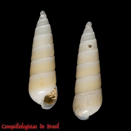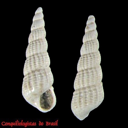 CLASSE: GASTROPODA: MARINHO FAMÍLIA: PYRAMIDELLIDAE ESPÉCIE: Chrysallida gemmulosa (C. B. Adams, 1850) Tamanho médio: 1,5 - 4 mm Profundidade: 1 a 2 m Habitat: Alimentação: carnívoro Frequência: incomum Ocorrência no Brasil: PE Localidade Tipo: Jamaica Sinônimos: Odostomia gemmulosa C. B. Adams, 1850; Menestho gemmulosa (C. B. Adams, 1850); Dunkeria gemmulosa (C. B. Adams, 1850) Descrição original: Adams, C. B. (1850). Descriptions of supposed new species of land shells which inhabit Jamaica. Contributions to Conchology. 6: 90-98., available online at https://www.biodiversitylibrary.org/page/13796504 Referência: Pimenta A.D., Absalão R.S. & Miyaji C. (2009). A taxonomic review of the genera Boonea, Chrysallida, Parthenina, Ivara, Fargoa, Mumiola, Odostomella and Trabecula (Gastropoda, Pyramidellidae, Odostomiinae) from Brazil. Zootaxa 2049 : 39-66 WoRMS: https://www.marinespecies.org/aphia.php?p=taxdetails&id=420440 Malacolog: http://www.malacolog.org/search.php?nameid=7397 Foto A: Praia de Gaibú, Pernambuco. 2,3 mm....