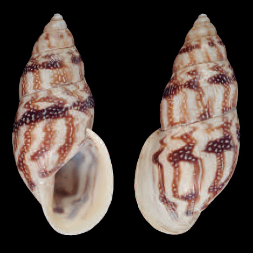 CLASSE: GASTROPODA: TERRESTRE FAMÍLIA: BULIMULIDAE ESPÉCIE: Drymaeus ambustus (Reeve, 1849) Tamanho médio: 29 mm Ocorrência: Equador, "Between Jacunga [Província Cotapaxi, Latacunga] e / [Província Tungurahua] Ambato" Localidade tipo: não consta na descrição original Nome original: Bulimus ambustus Reeve, 1849 Sinônimos: Bulimus chamaeleon L. Pfeiffer, 1855; Drymaeus (Drymaeus) ambustus (Reeve, 1849) Fotos: (1,2) Natural History Museum, London: LECTOTYPE NHMUK 1975441.1-3, "Tucunga, Ambato, Between Tucunga and Ambato", Equador, coll Hugh Cuming, Bourcier leg., 29.0mm; (3) SYNTYPE de Bulimus chamaeleon Pfeiffer, 1855, NHMUK 1975443, próximo a Quito, Equador, coll Hugh Cuming, 29mm Fontes: Descrição original: (como Bulimus ambustus Reeve, 1849) Reeve, L. A. (1848-1850). Monograph of the genus Bulimus. In: Conchologia Iconica, or, illustrations of the shells of molluscous animals, , vol. 5, pls. 1–89 and...