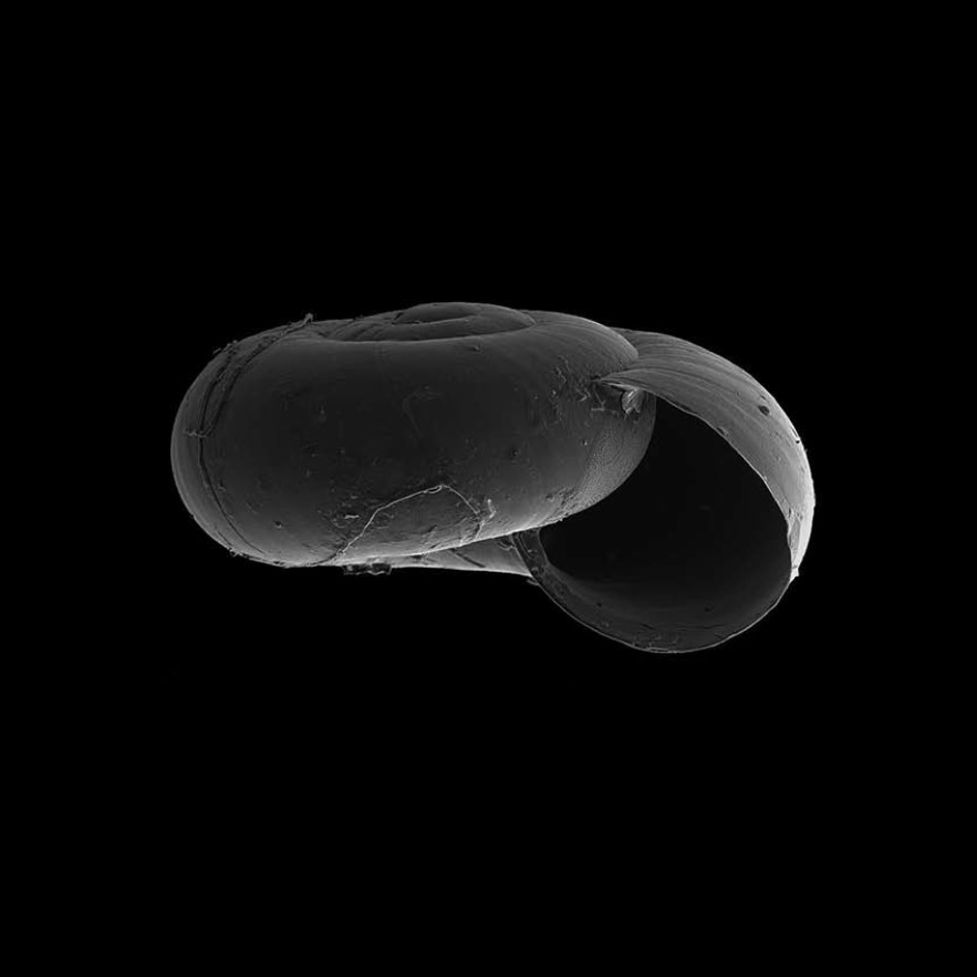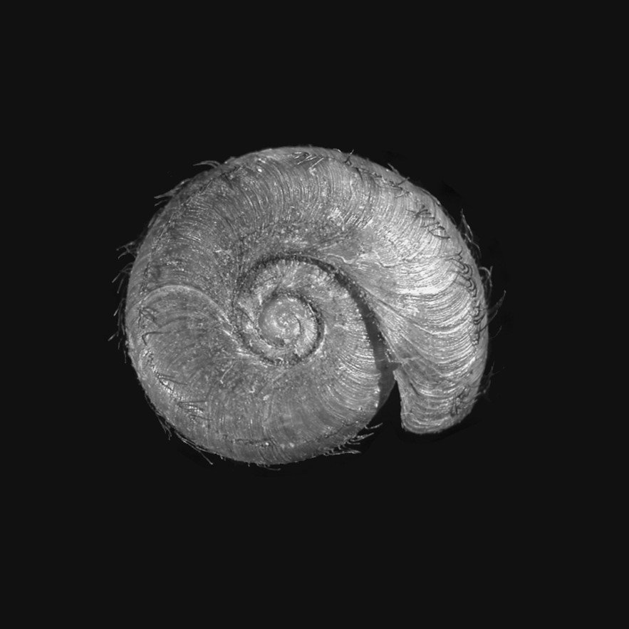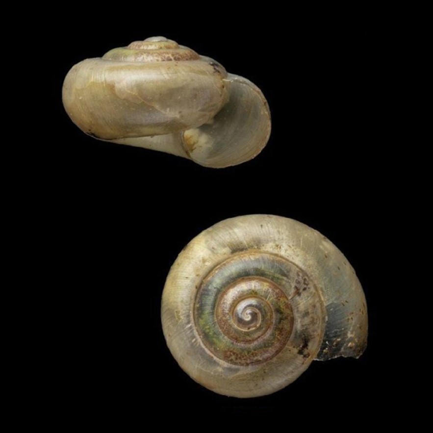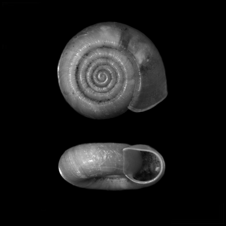 CLASSE: GASTROPODA: TERRESTRE FAMÍLIA: SCOLODONTINAE ESPÉCIE: Hirtudiscus excisa (Reeve, 1854) Tamanho médio: 3.9 mm Distribuição: Colômbia (Cundimarca) Localidade tipo: "Santa Ana, New Granada" Nome original: Helix excisa Reeve, 1854 Sinônimos: Drepanostomella excisa (Reeve, 1854) Redescrição: "Shell nearly discoid; spire slightly elevated; with 3.75 whorls; protoconch 1.5 whorls, with distinct spiral striae; teleoconch with dense growth-striae carrying damaged periostracal hairs of up to 0.05 mm; body whorl rounded; aperture narrow near the suture, widening near the base (saccate); peristome sharp, neither expanded nor thickened; with an incision in the parietal angle of the aperture near the suture; suture deeply impressed; umbilicus wide, occupying about 40% of shell width" Fotos: (1-3) Natural History Museum (London): SYNTYPE de Hirtudiscus excisa, NHMUK 20130191, "New Granada", leg....