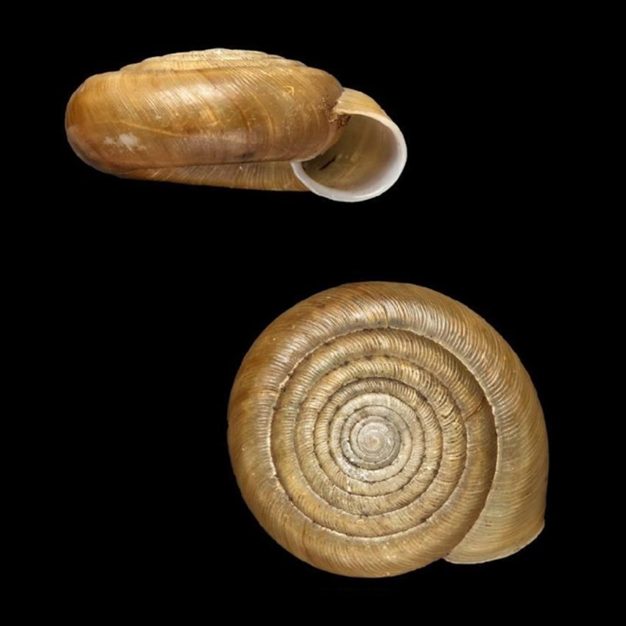 CLASSE: GASTROPODA: TERRESTRE FAMÍLIA: SCOLODONTIDAE ESPÉCIE: Polygyratia polygyrata (Born, 1778) Tamanho médio: 44 - 50 mm Habitat: Mata Atlântica - vive no solo, sob folhas ou enterrada parte do tempo Alimentação: Herbívoro Ocorrência: Brasil, Bahia (Leste do Estado) Localidade tipo: desconhecida (Born, 1780); “Brazil” de acordo com Schileyko (2006) Nome original: Helix polygyrata Born, 1778 Sinônimos: Helix charybdis Mörch, 1852; Polygyratia charybdis (Mörch, 1852) Redescrição: (Roosen, Salvador & Breure, 2025): "Shell planispiral, large, width 40–47 mm, height 11–13 mm, multiwhorled; whorls 8½–9. Spire typically slightly depressed, but often flat. Whorl profile markedly convex, with gentle angulation marking borders of apical and umbilical regions; a central angulation on the body whorl can be seen in some specimens. Whorls tightly coiled, slowly and regularly...