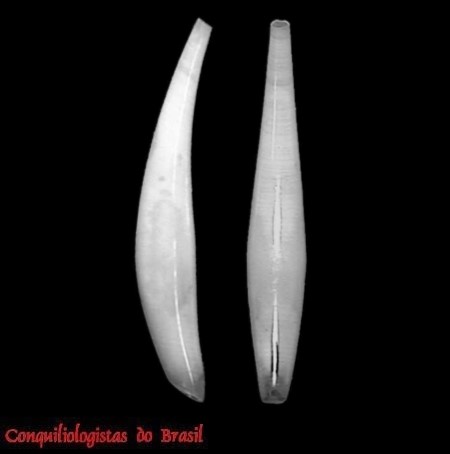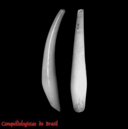 CLASSE: SCAPHOPODA : MARINHO FAMÍLIA: GADILIDAE ESPÉCIE: Compressidens pressus (Sharp & Pilsbry, 1897) Tamanho médio: ~12 mm Profundidade: 168 - 1431 m Habitat: Lodo e areia - Vive em fundos lodosos ou arenosos Alimentação: Carnívoro - Alimenta-se de outros animais Ocorrência no Brasil: Bahia até Rio de Janeiro Localidade tipo: Culebra Island, West Indies, Challenger sta 24, 18º38’30"N, 65º05’30"W, 714 m Nome original: Dentalium (Compressidens) pressum Sharp & Pilsbry, 1897 Sinônimos: Compressidens pressum [sic]; Dentalium pressum Sharp & Pilsbry, 1897; Pulsellum pressum (Sharp & Pilsbry, 1897) Comentários: Molluscabase, 2025 e Caetano, Scarabino & Absalão (2006) consideram a Família Gadilidae como incertae sedis Fotos: (1) Caetano, Scarabino & Absalão (2006): Compressidens pressus (Sharp & Pilsbry, 1897), IBUFRJ 10966, 9 mm ...